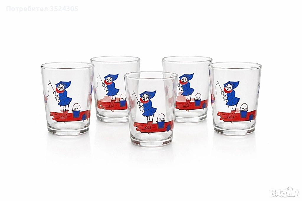 Комплект от 5 стари чаши за вино, вода или лимонада, 7.5 см. Чашите са с ярки цветни илюстрации на детски мотиви, което им придава ретро визия. Подходящи за ежедневна употреба или за украса на дома.