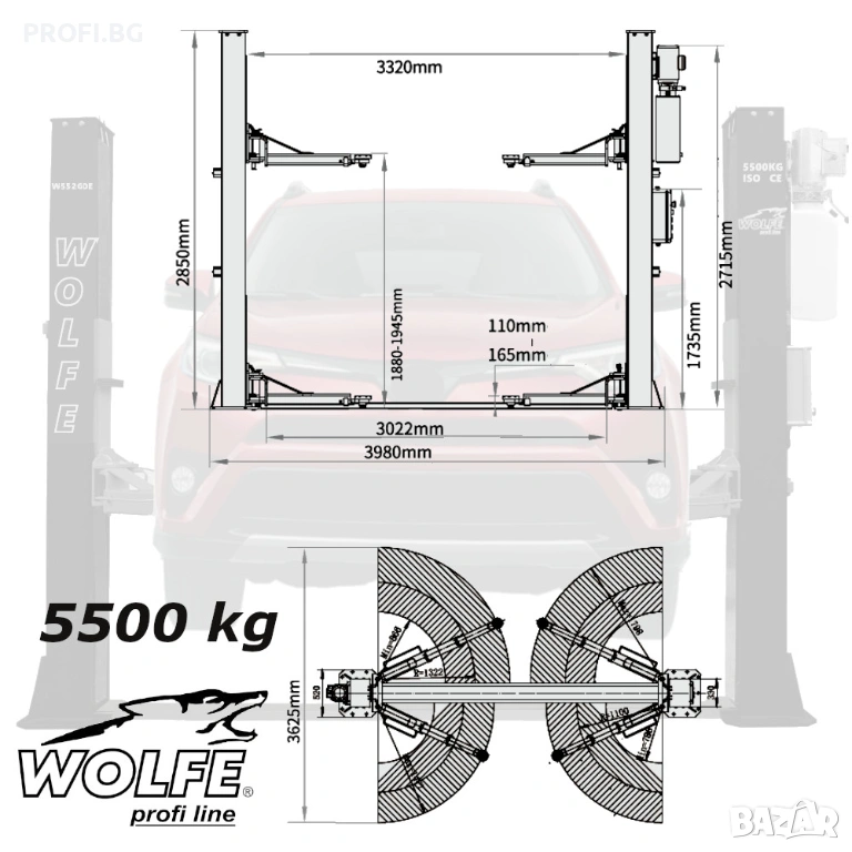 Подемник 5.5 тона, двуколонен, за автомобили и микробуси дълга база, със симетрични тройно телескопични рамена и двойно заключваща електромагнитна система. Автоматичен ел.изключвател при достигане на максимална височина на повдигане.
