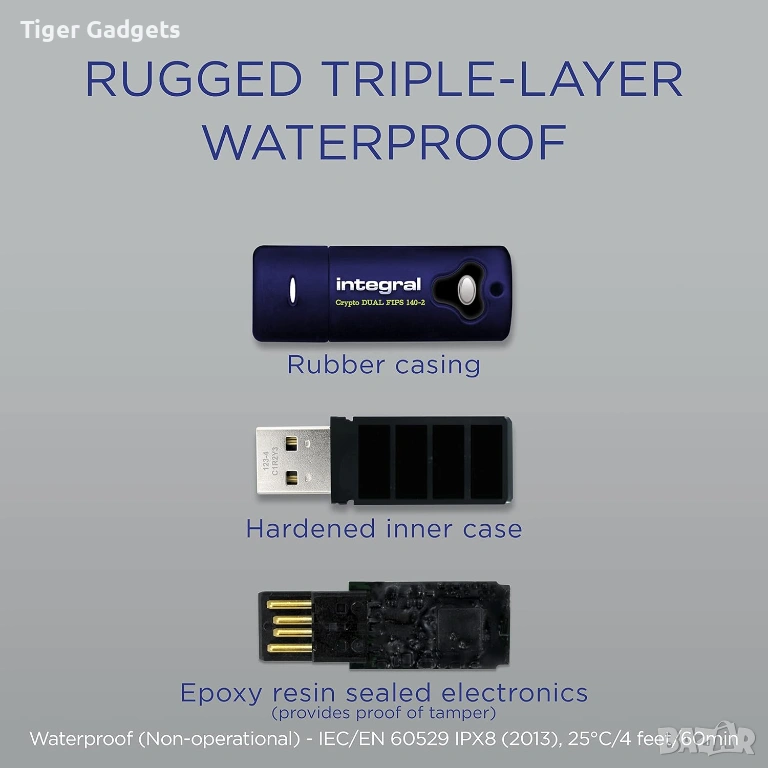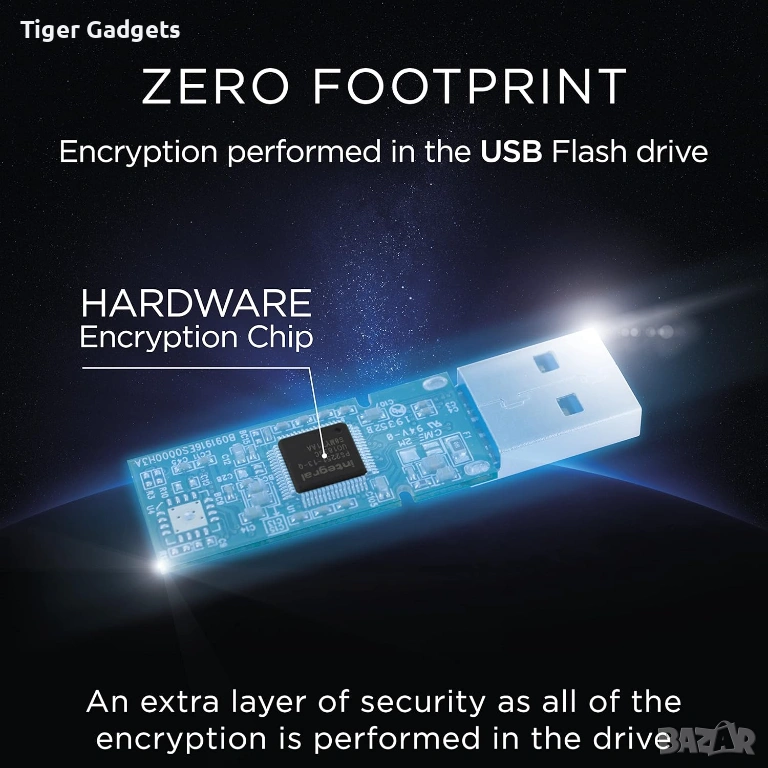 Флашката е сертифицирана по FIPS 197 стандарт и разполага със защита срещу brute-force атаки, като автоматично блокира достъпа при многократни грешни опити за въвеждане на парола.