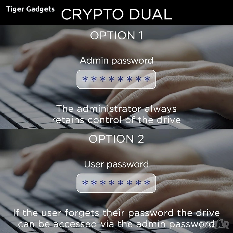 Моделът предлага двойна паролна защита (Dual Password) – възможност за създаване на потребителска и администраторска парола, което позволява по-гъвкав контрол върху достъпа до файловете.