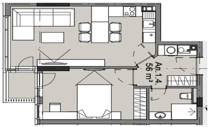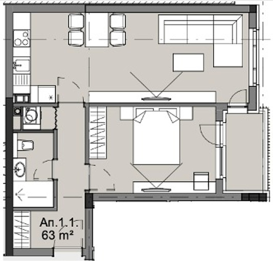 Тип : 2-стаен (дневна + 1 спалня)