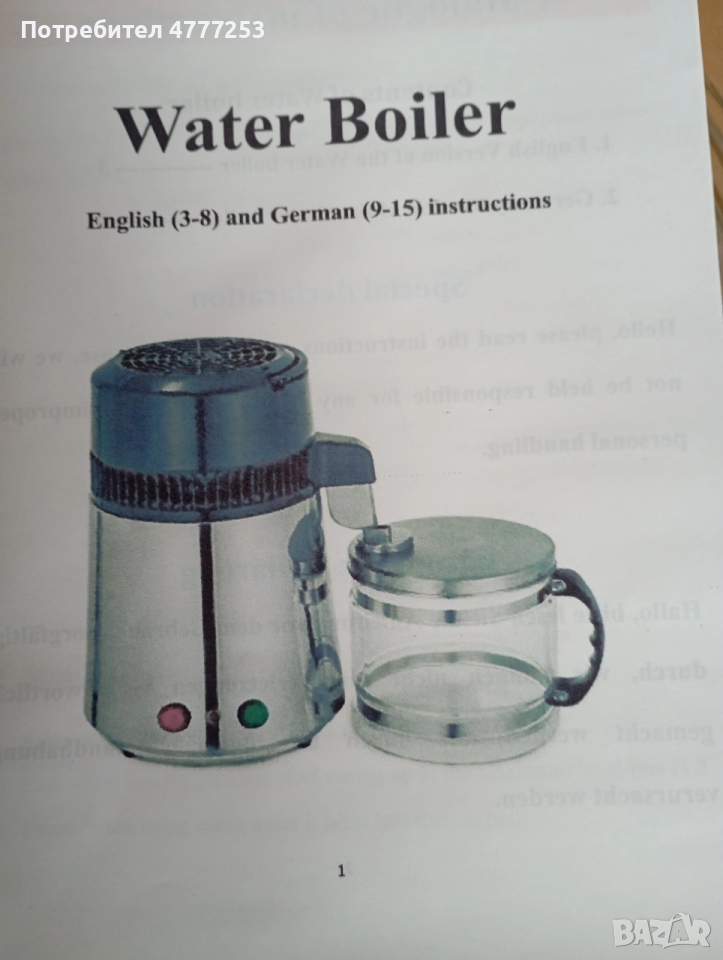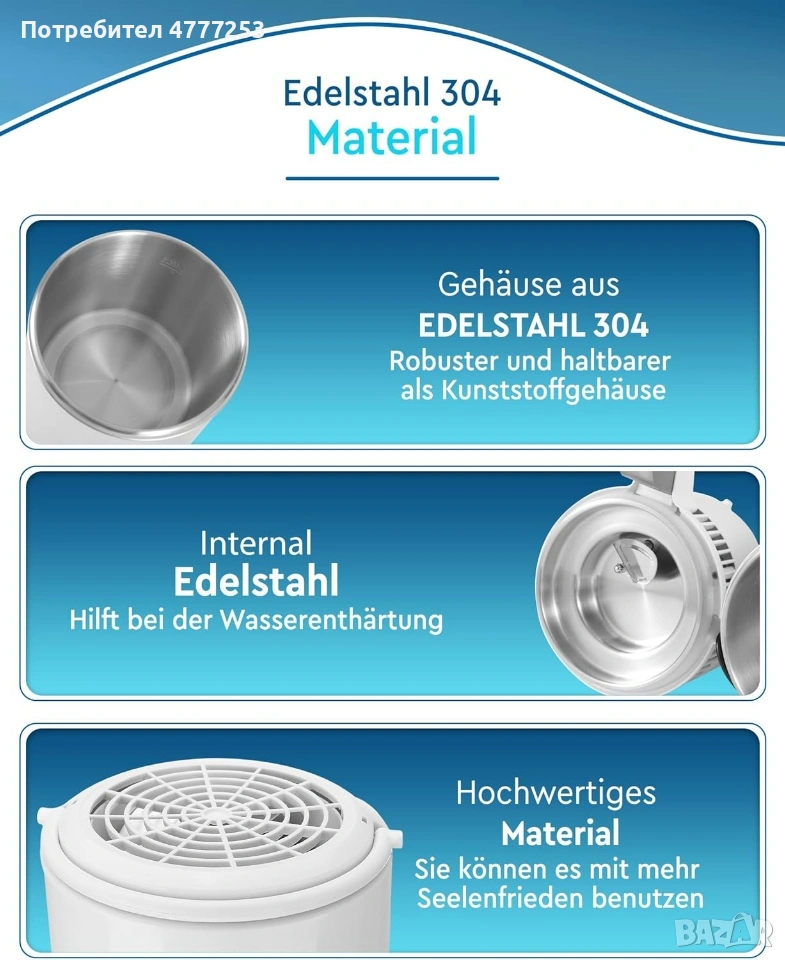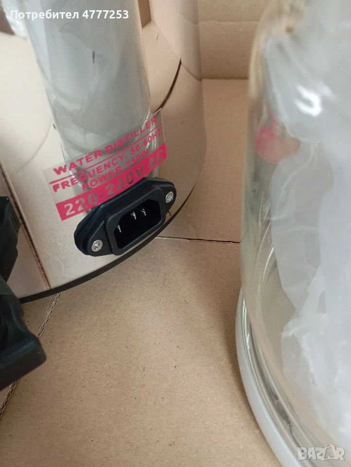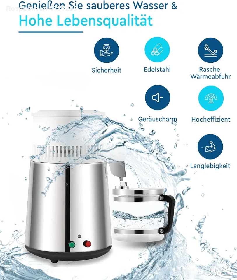 Изработен от неръждаема стомана 304, която осигурява висока чистота на дестилираната вода. Контейнерът за вода е изработен от висококачествено стъкло, без пластмаса