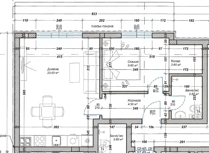Дневна с кухненски бокс (23 м2): Просторно и правилно помещение.