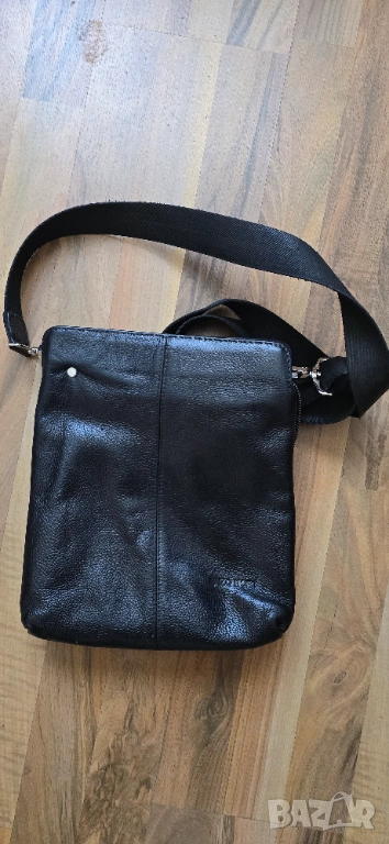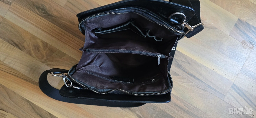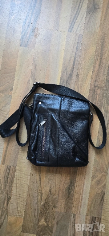 Мъжка кожена чанта през рамо. Естествена кожа. Размери 29х25х6 см. Множество джобове затваряни се с цип. Регулируема препратка.