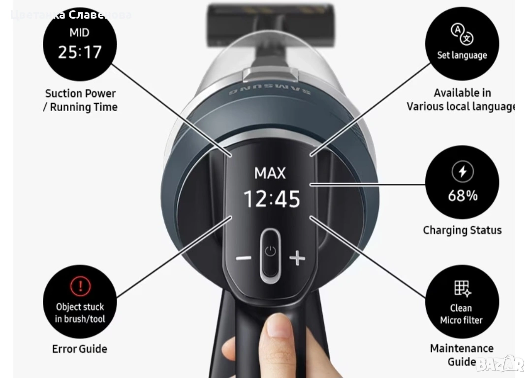 Най-лесният начин да се уверите, че вашата прахосмукачка работи правилно, е да погледнете вградения цифров екран, който поддържа различни езици. Можете да видите нивото на мощност и оставащия живот на батерията и ви предупреждава за проблеми, като предлага решения.
