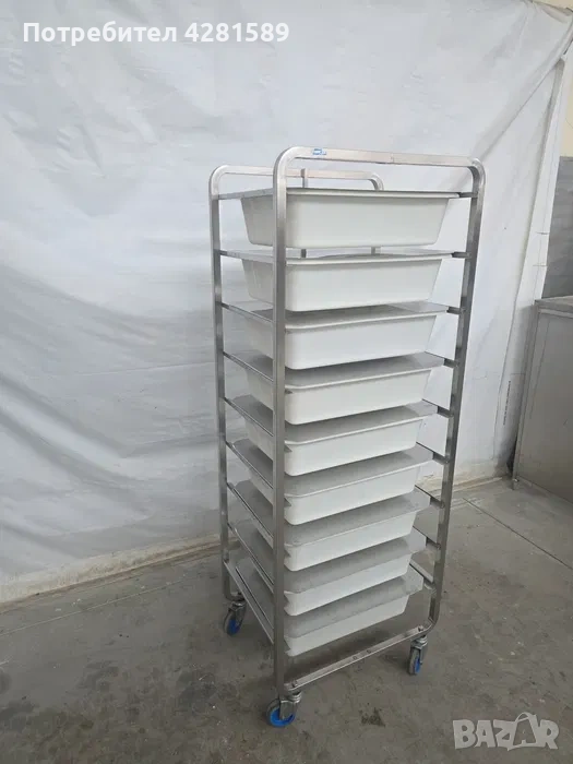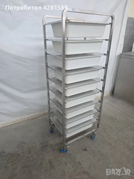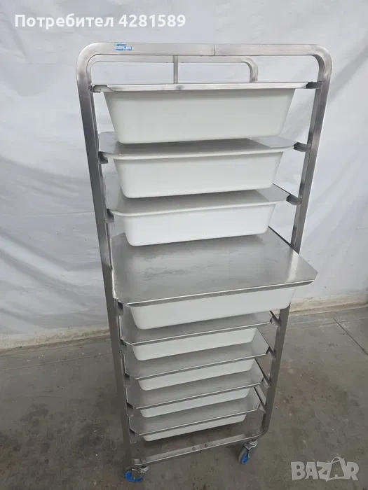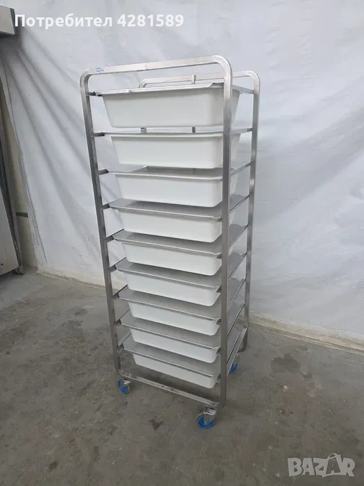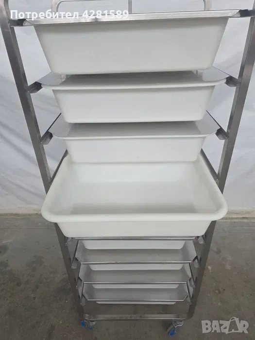 Продавам немска спомагателна работна количка с легени за продукти-тесто,брашно и др.Количката е с височина 178см,размери на легените:60/40/14см.