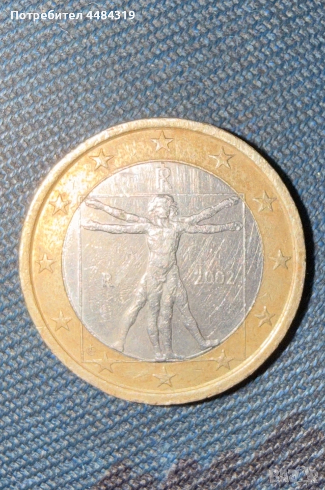 Италианска монета от 1 евро 2002г. Ветрувианският човек на да Винчи → Обява 53972306