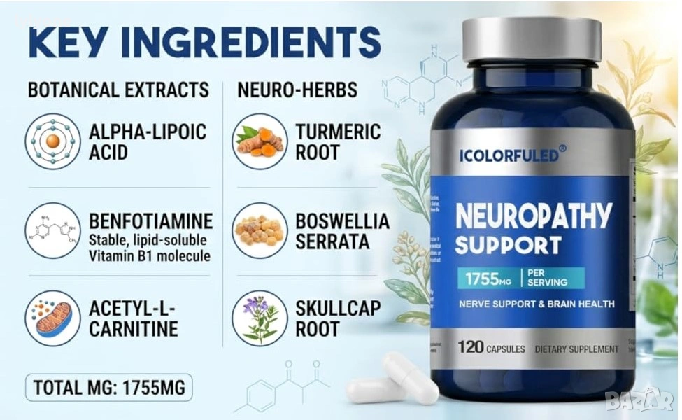 Продавам комплексна добавка за подкрепа на нервната система Neuropathy Support на марката HERBVIDA (IcolorfulLED). Продуктът е чисто нов, запечатан, закупен от Amazon Испания.