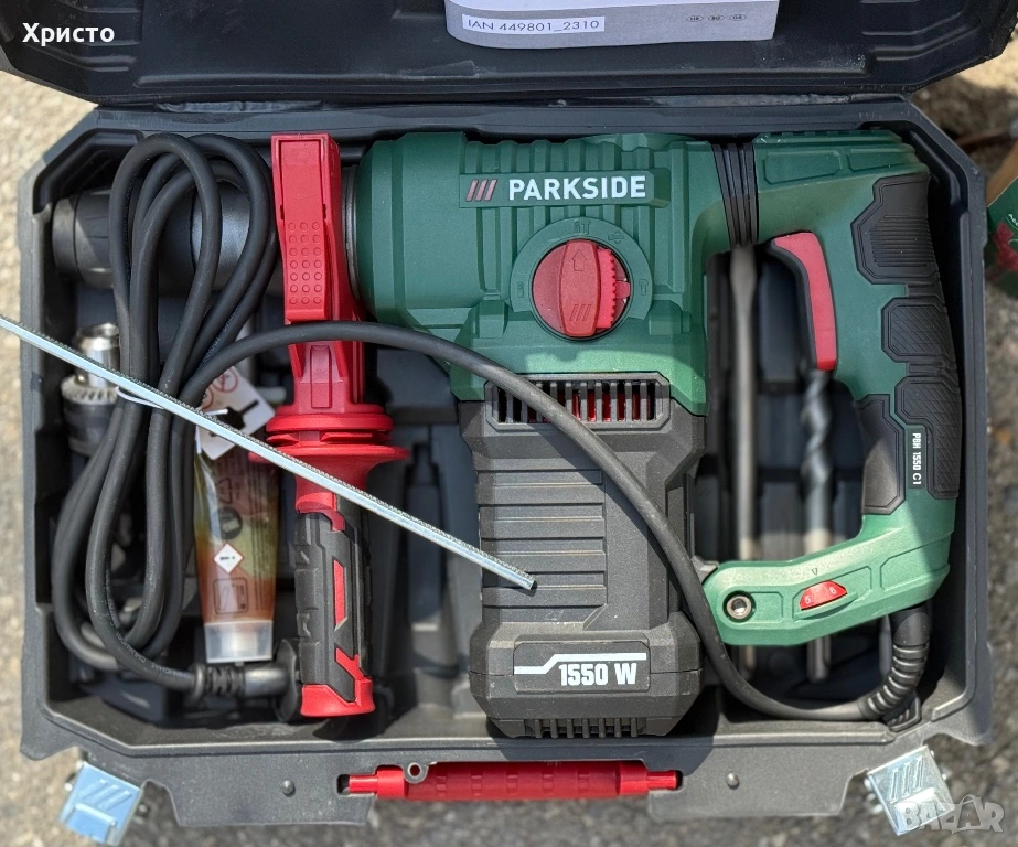 Продавам перфоратор PARKSIDE PBH 1550 C1 в състояние като нов. Машината не е използвана никога – само е отворена кутията. Всичко е налично и в перфектно състояние, без следи от употреба. Подходящ както за домашни ремонти, така и за по-сериозна работа – пробиване и къртене.Продава се в оригиналния комплект с куфар за съхранение.