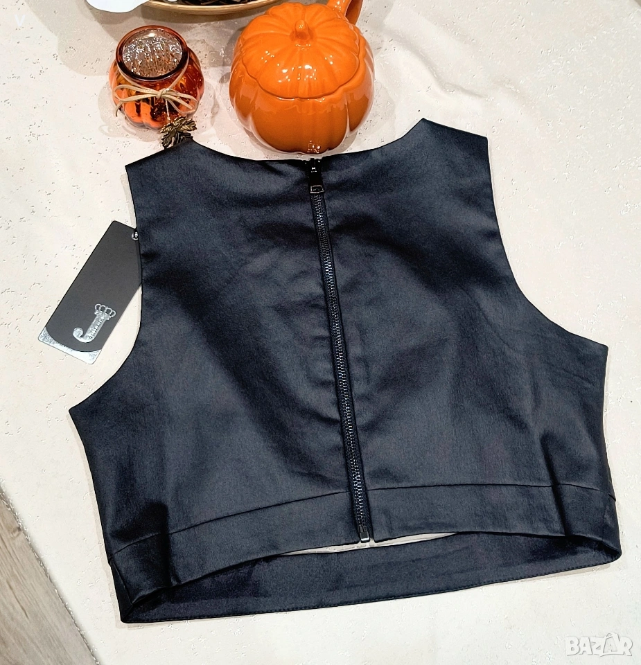 Страхотно черно кожено бюстие с кафяв акцент и цип отзад. По етикет е 40 номер, подходящо за дами М и малък Л. Изпращам с преглед и тест в оригинална опаковка.