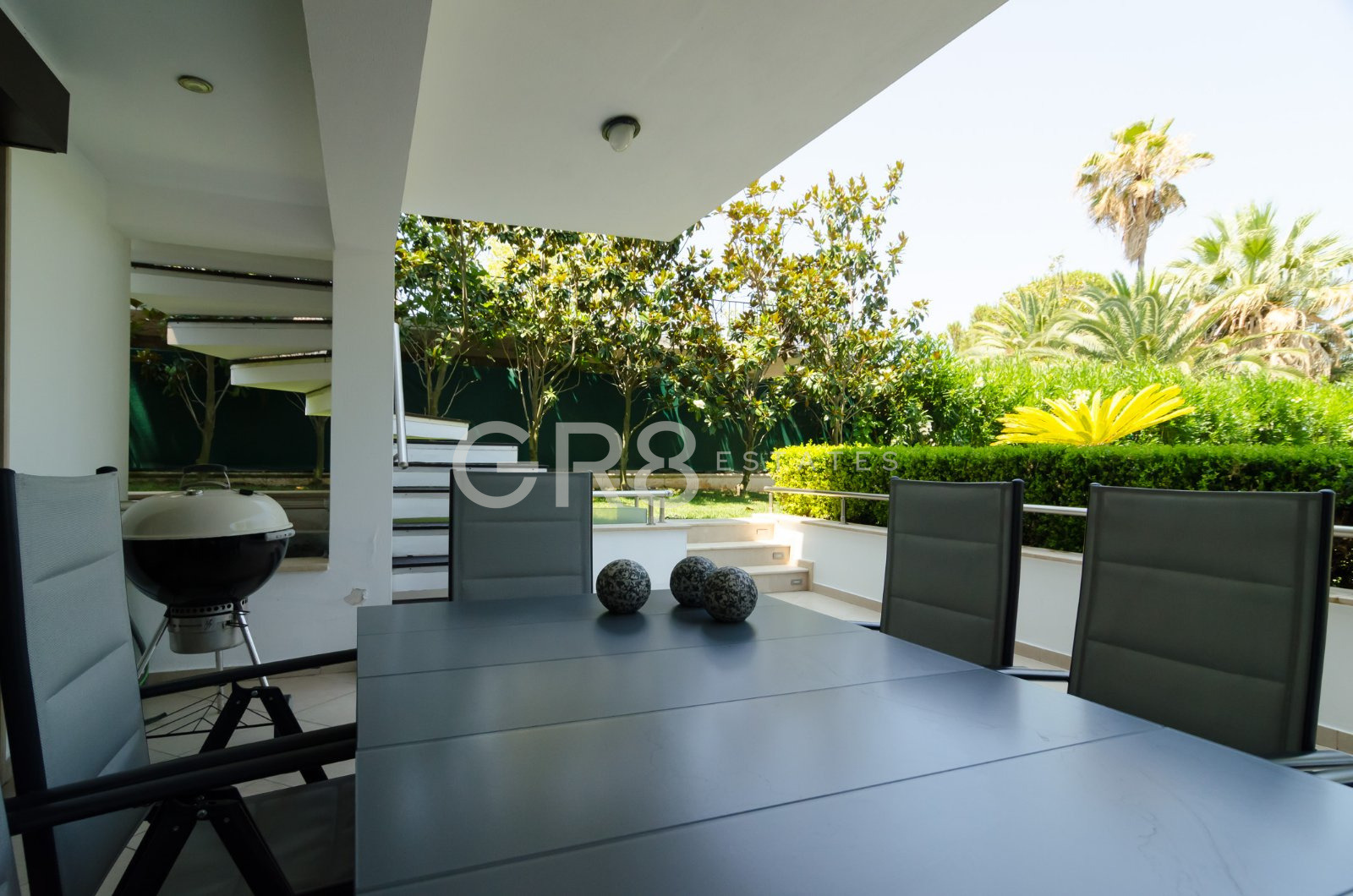 Тропически оазис: Двор от 1500 кв.м, майсторски озеленен с високи палми и екзотична растителност, създаващи естествена прохлада и дискретност.