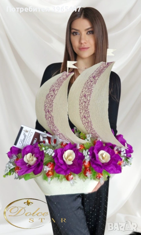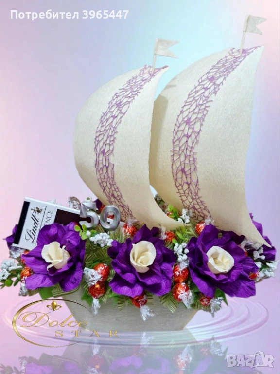 Корабът е аранжиран с ръчно изработени цветя от италиански креп, 32 бонбона Lindor и шоколад Lindt.