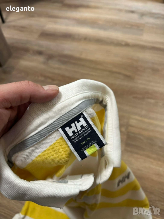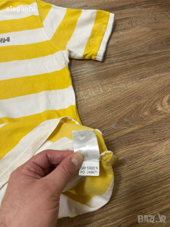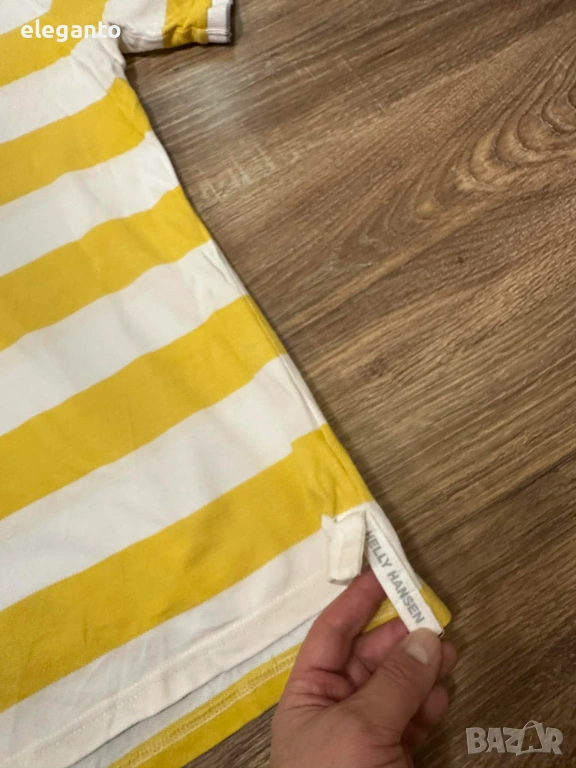 Дизайн: Широки хоризонтални жълти и бели райета с класическа яка за поло.