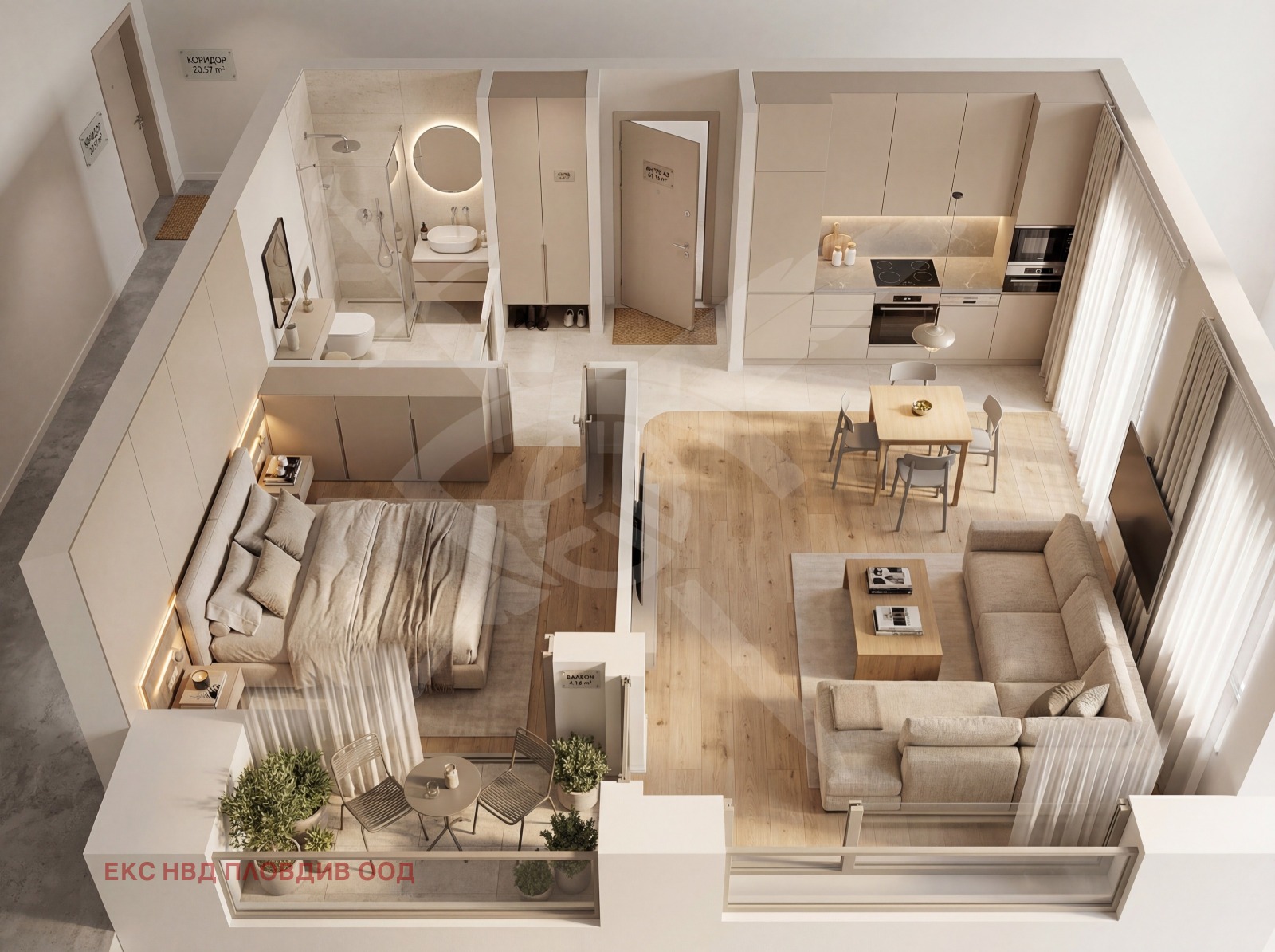 РАЗПРЕДЕЛЕНИЕ: Разполага с площ от 69 кв.м., разгърната в следното функционално разпределение: антре, баня с тоалетна, всекидневна с кухненски бокс, спалня, тераса.