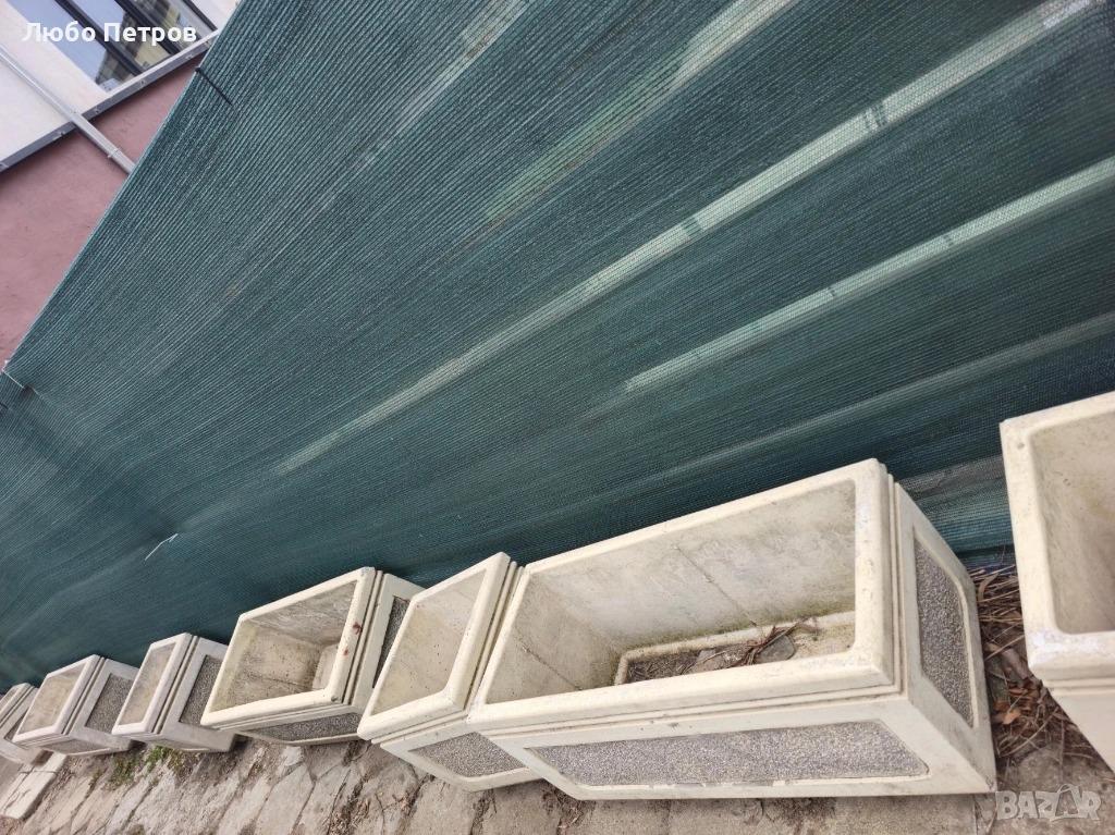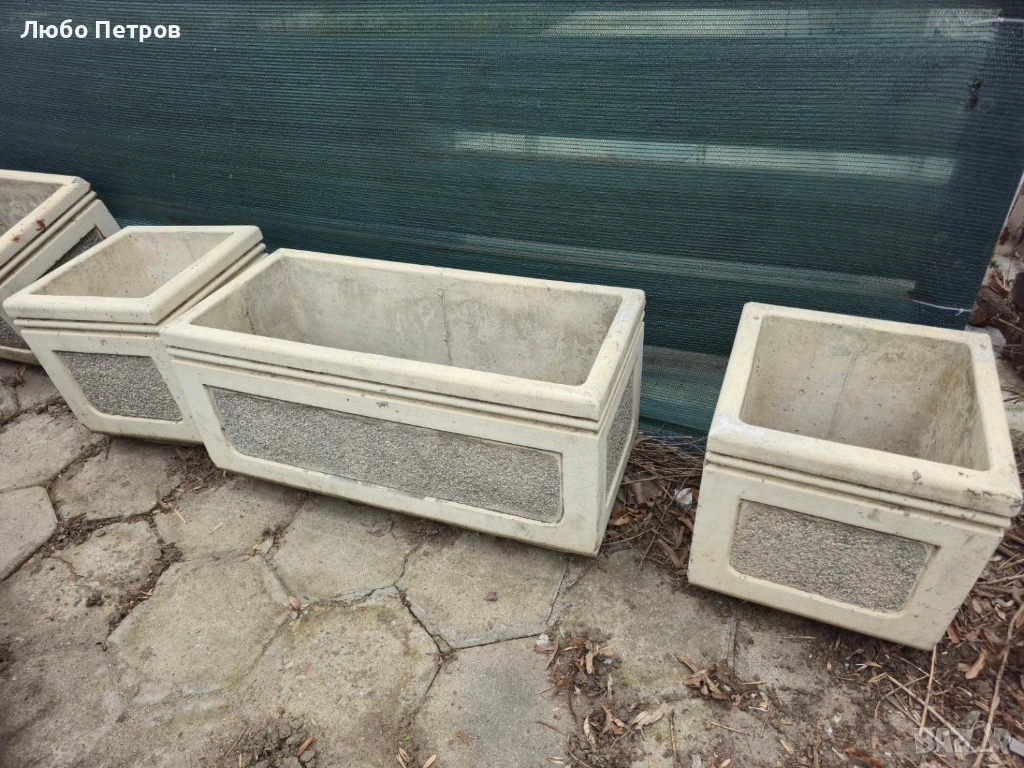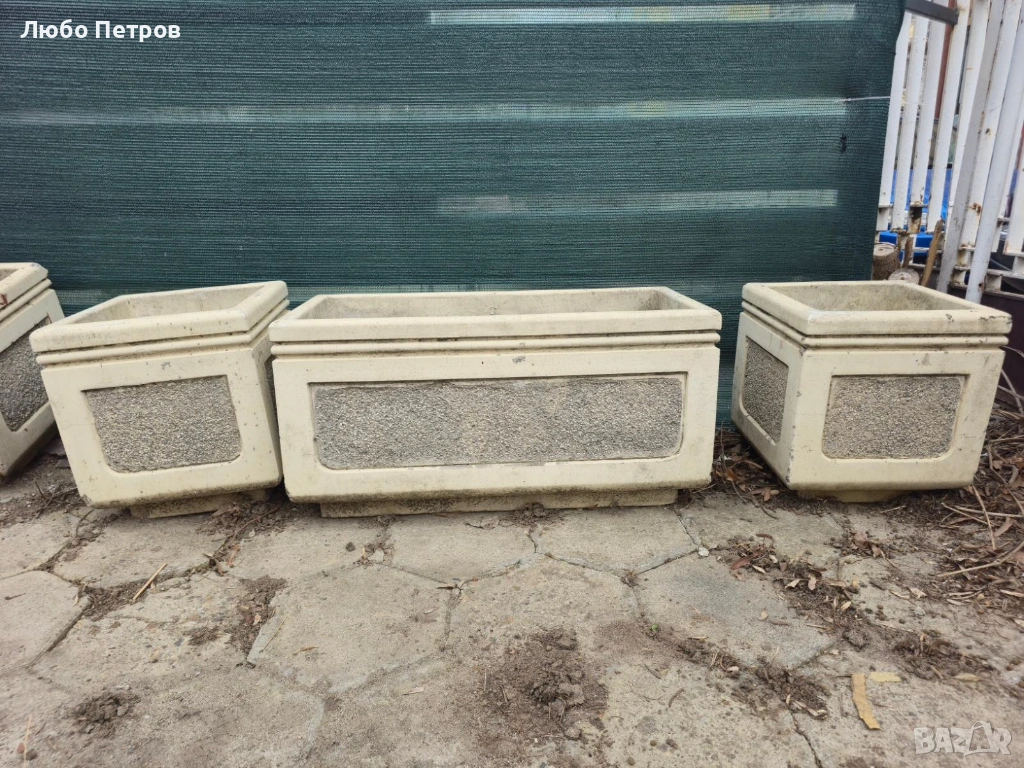 Продавам бетонни кашпи с мозаечен и гладък дизайн. 3 броя големи /ш-41, д-91, в-46 см., тегло 114кг. според производителя/ с цена 102 евро за брой и 4 броя малки /ш-41, д-41, в-46 см., тегло 62кг. според производителя/ с цена 51 евро за брой. Подходящи за цветя или други декоративни цели. Използвани, но в добро състояние. Без бартери.
