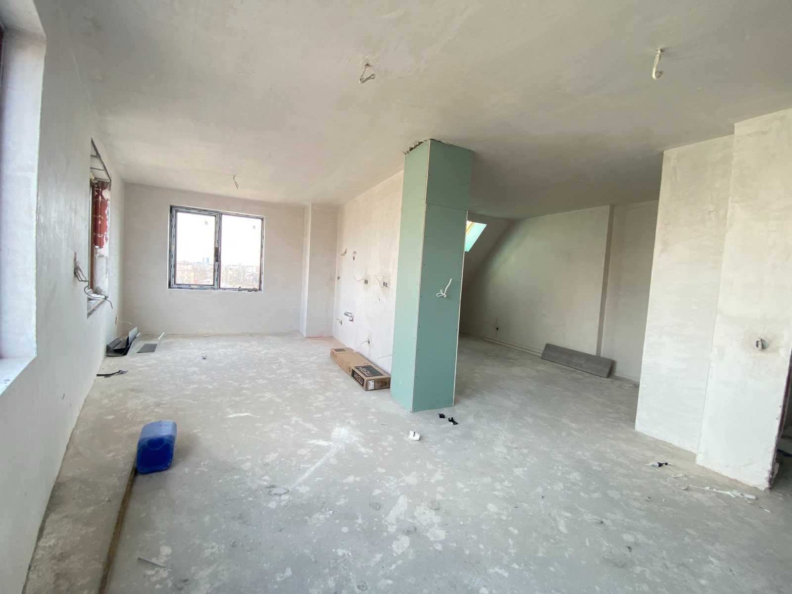 С акт 15. Акт 16 се очаква през средата на 2026 г. Жилището е ситуирано на етаж 7/7 в сграда със собствен двор и контрол на достъпа. Обща площ от 135 кв.м. с разпределение както следва: входно антре, дневна, кухненски бокс с трапезария, две спални, две бани със санитарен възел, два балкона и покривна тераса (извън квадратурата). Отоплението е на ток с изградено трасе за климатици.