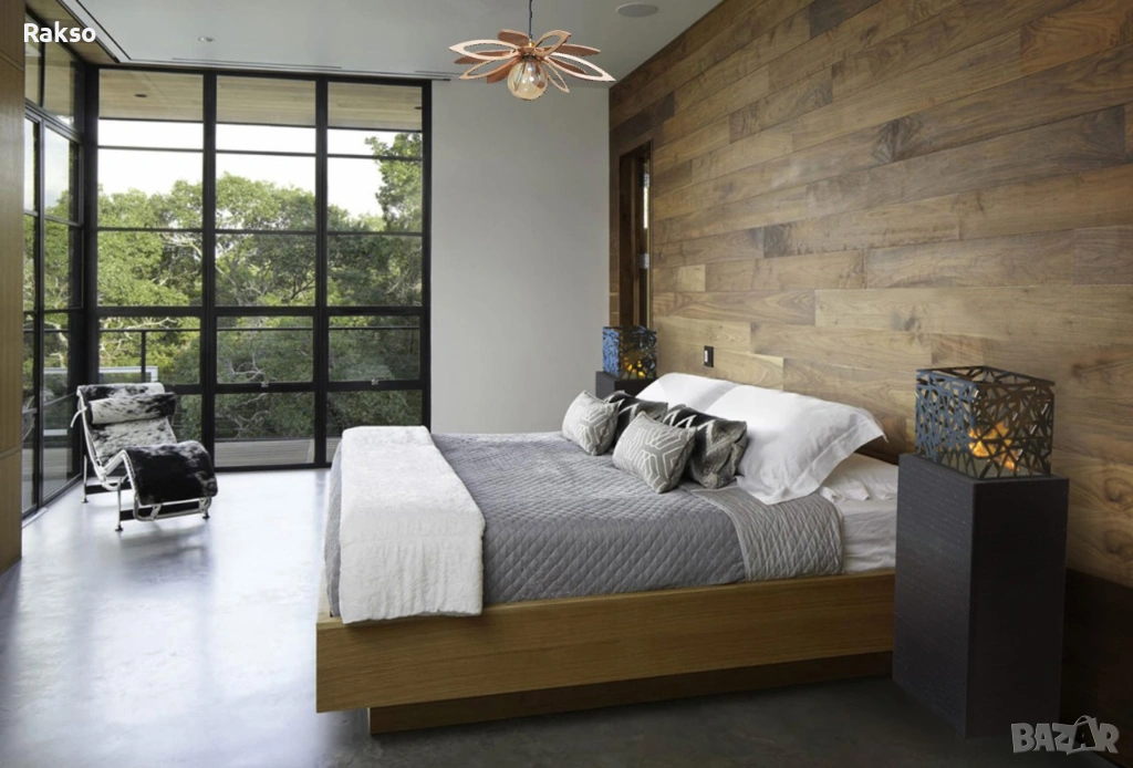 Полилей с уникален дървен абажур в модерен дизайн. Осветителното тяло в