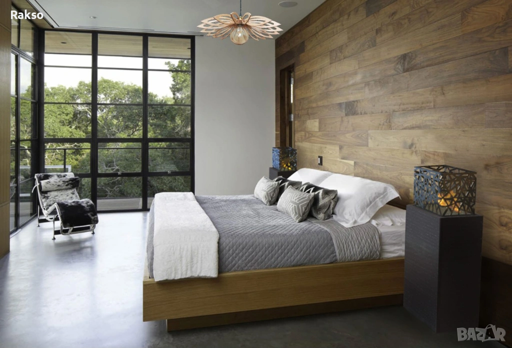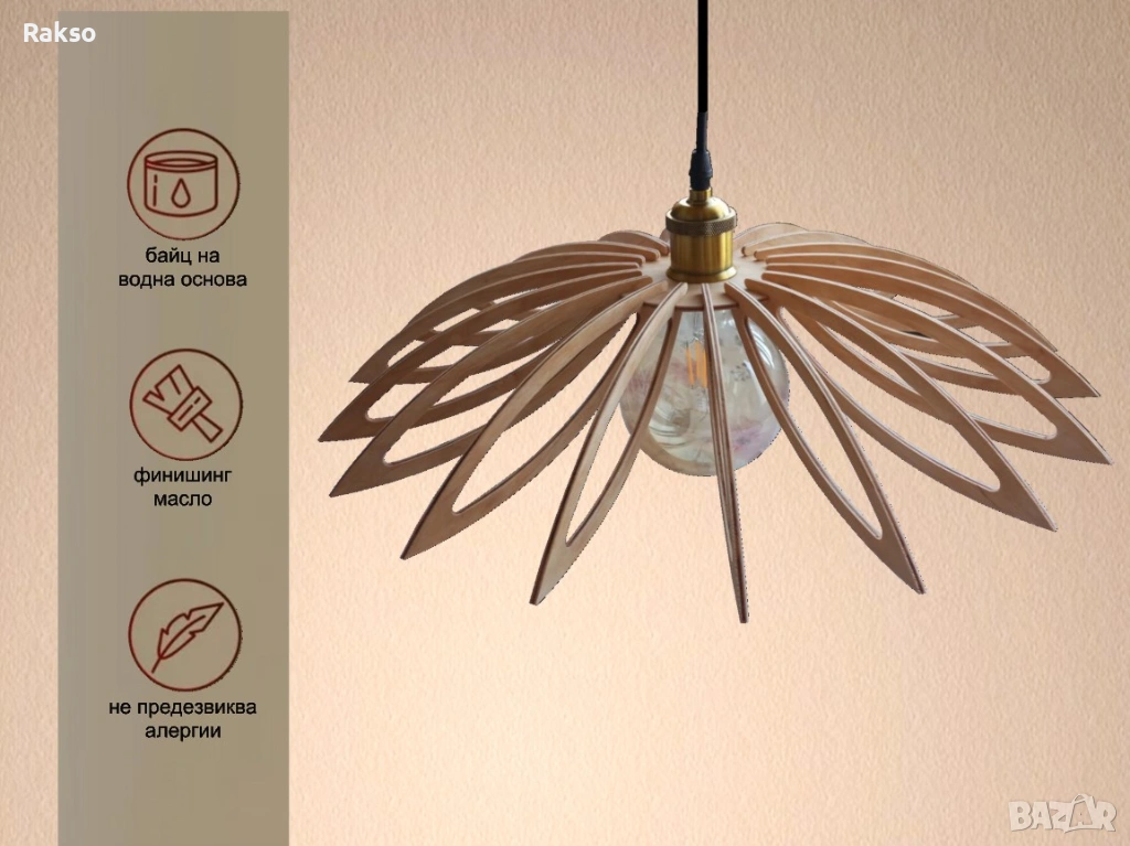 Полилей с уникален дървен абажур в модерен дизайн. Осветителното тяло в