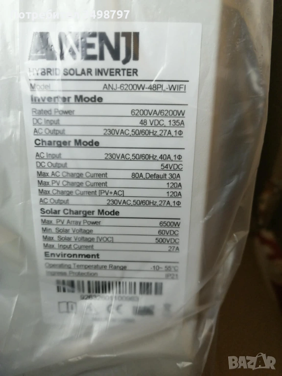 хибриден инвертор с непрекъсната изходна мощност от 6200W (6.2kW), пикова от 12kW (120000W), с MPPT контролер за зареждане до 120A!