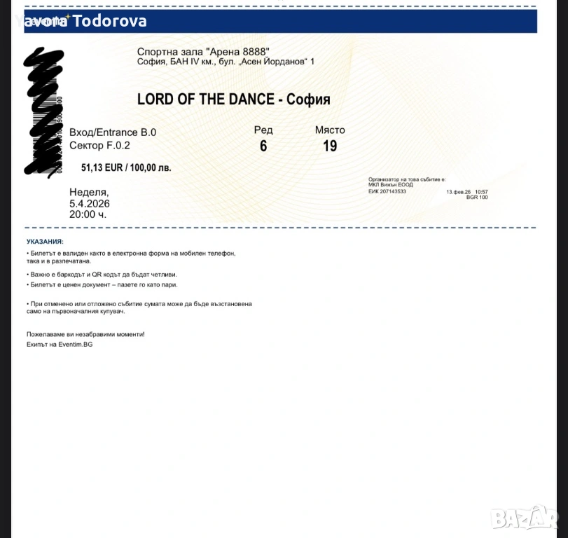2 Билета за представлението “Lord of the Dance” - 100 лв/51,13€ за 1 билет. Цената съответства към оригиналната + административната такса.