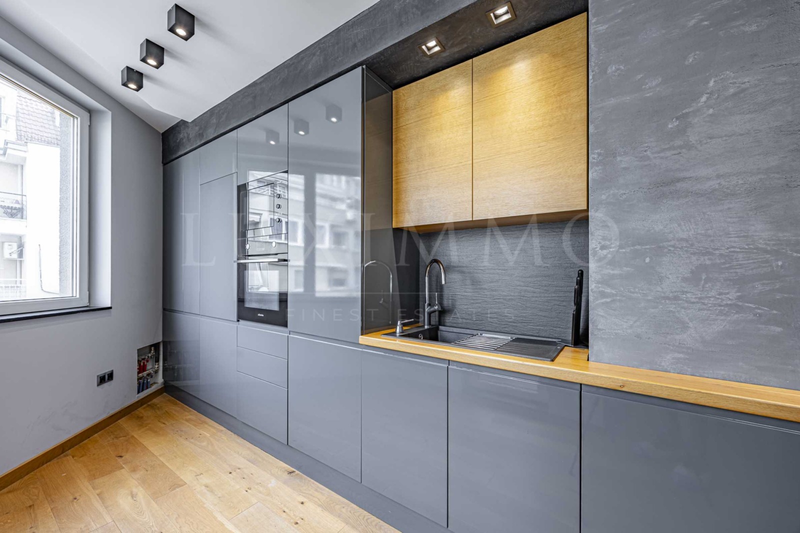 Апартаментът е завършен и обзаведен с внимание към детайла, в естествени цветове и материали, с усещане за уют и спокойствие. В дневната и спалнята е положен естествен дъбов паркет, а мебелите в спалнята, включително леглото, са изработени от масивен дъб комбинация от качество, устойчивост и стил.
