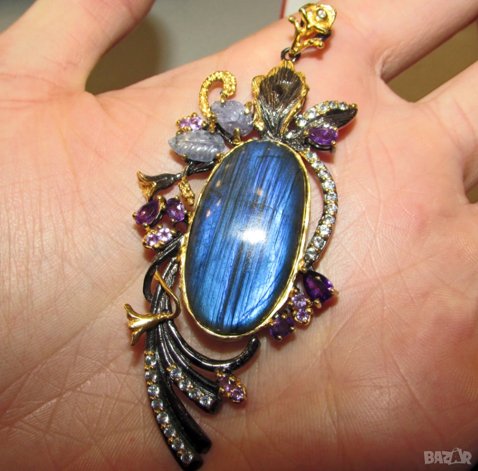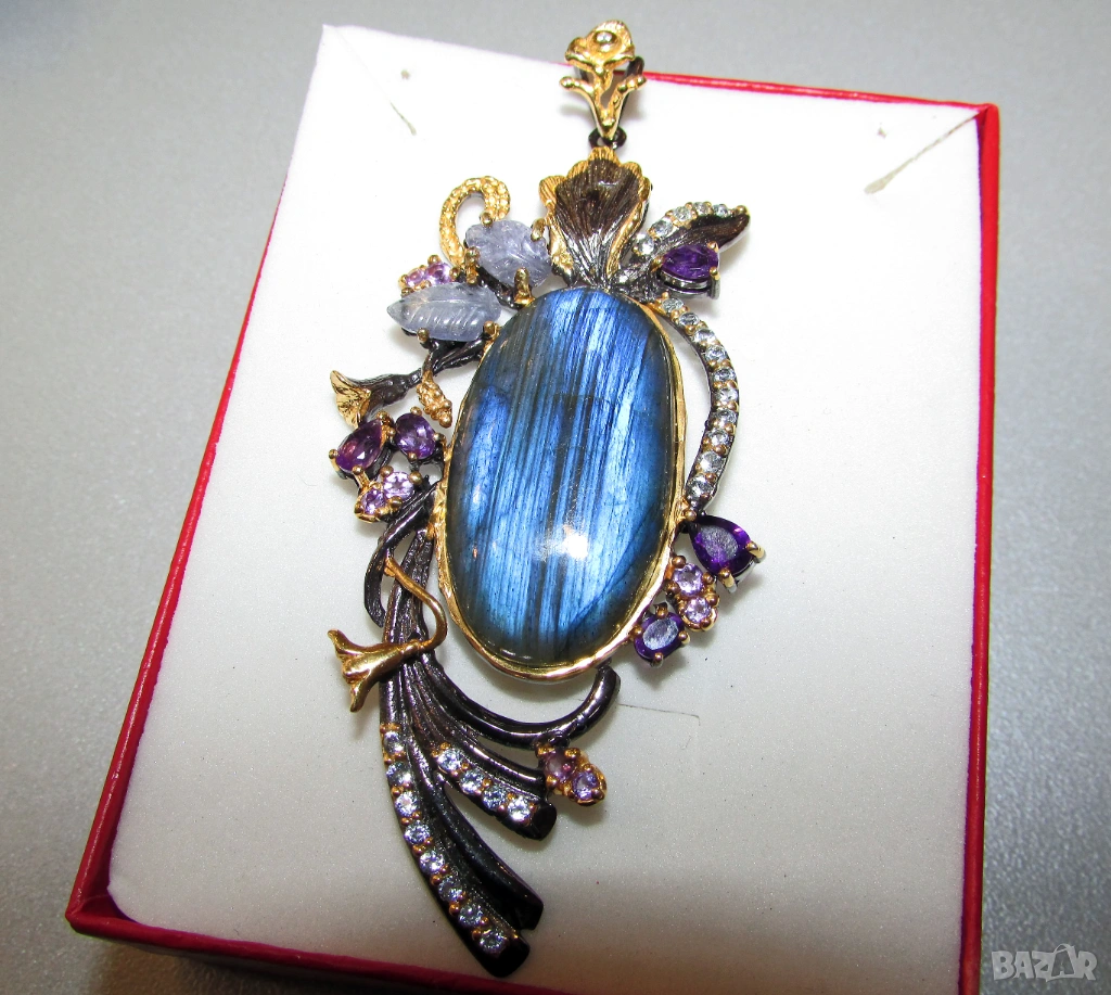 Сребърно колие с родиево и златно покритие. Минерала е лабрадорит. Размери 84x38x7, тегло 19.4гр. Произход Африка. Другите камъни са танзанит, аметист и топаз.