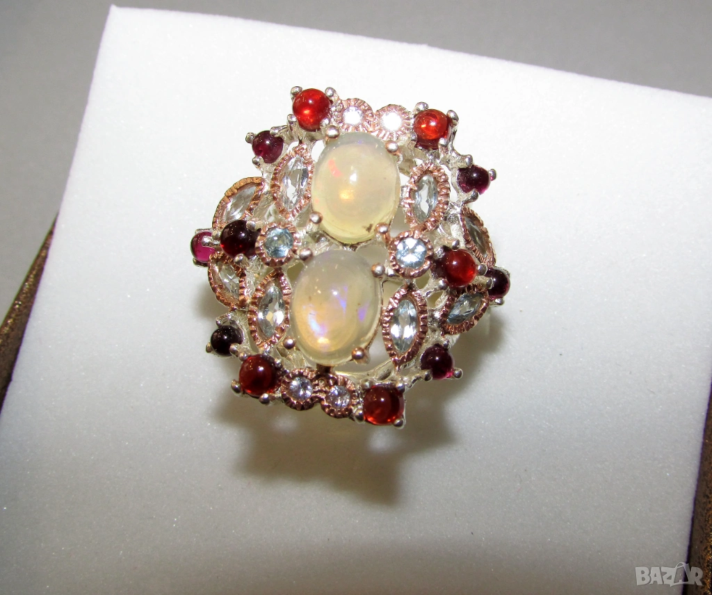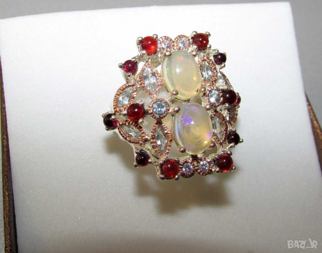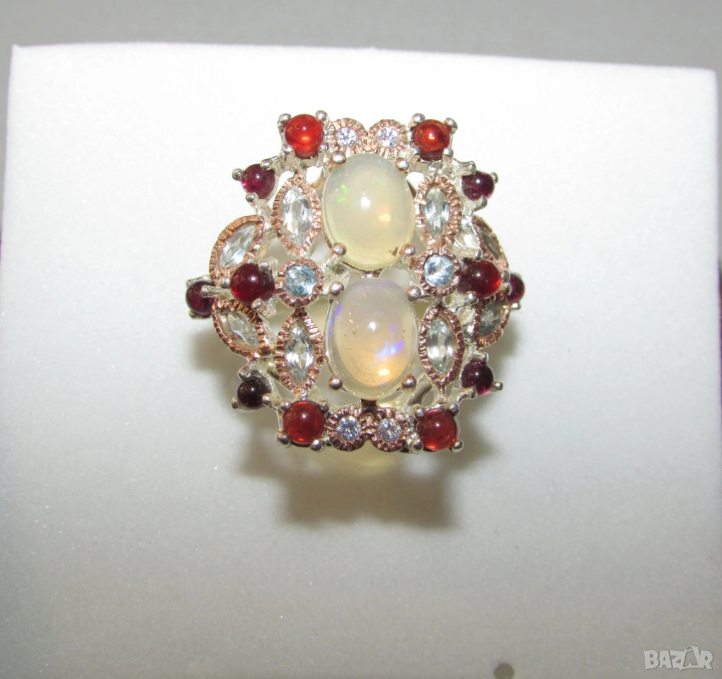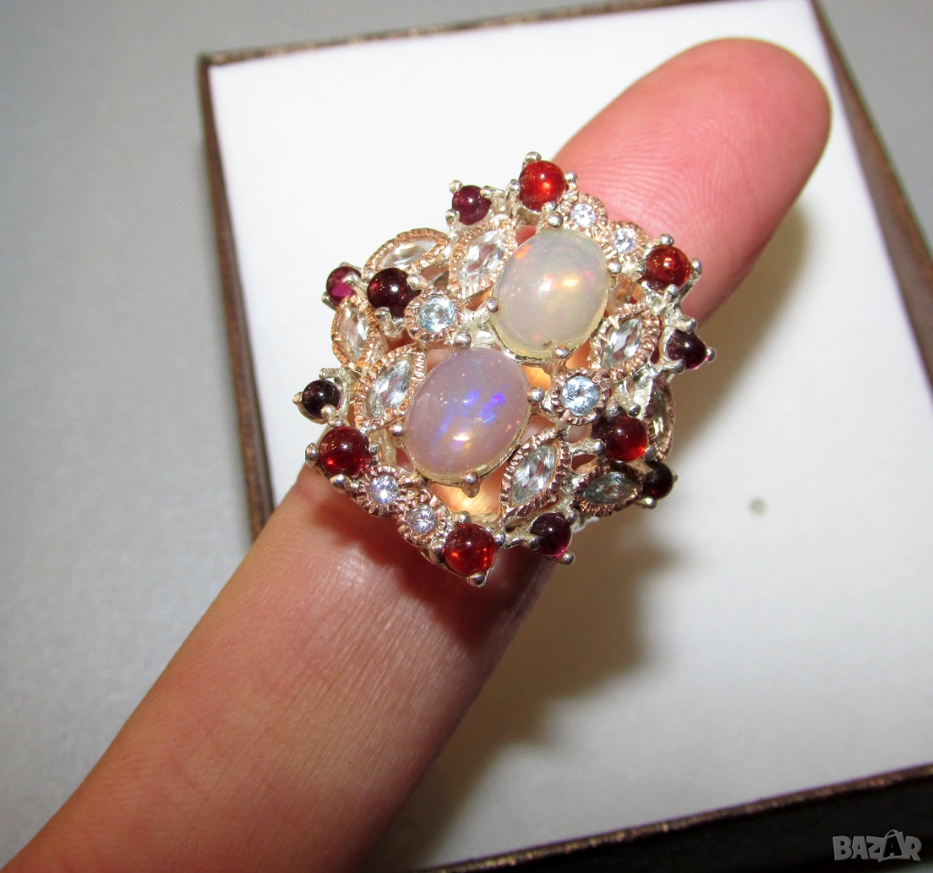 925 сребърен пръстен с етиопски опали. Опали 9х7мм, тегло на пръстена 10.5гр. Другите камъни са топаз и гранат. Халка 7/55. Цена 90 евро.