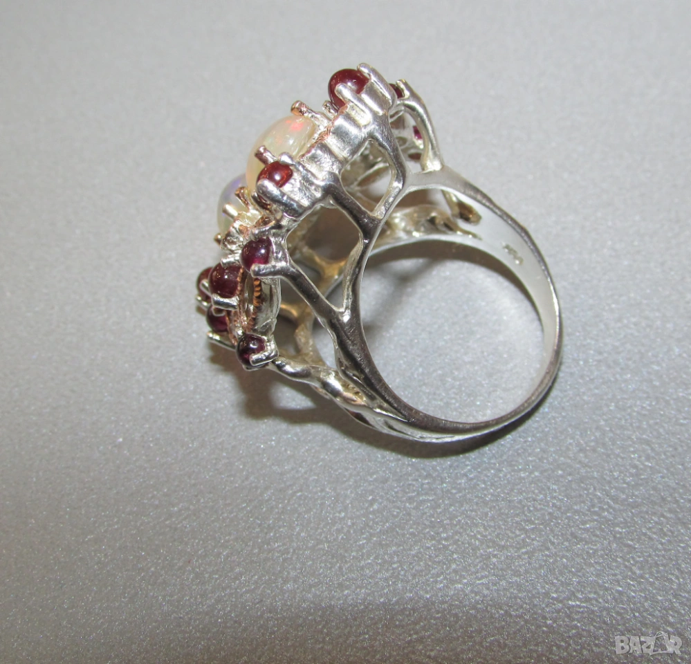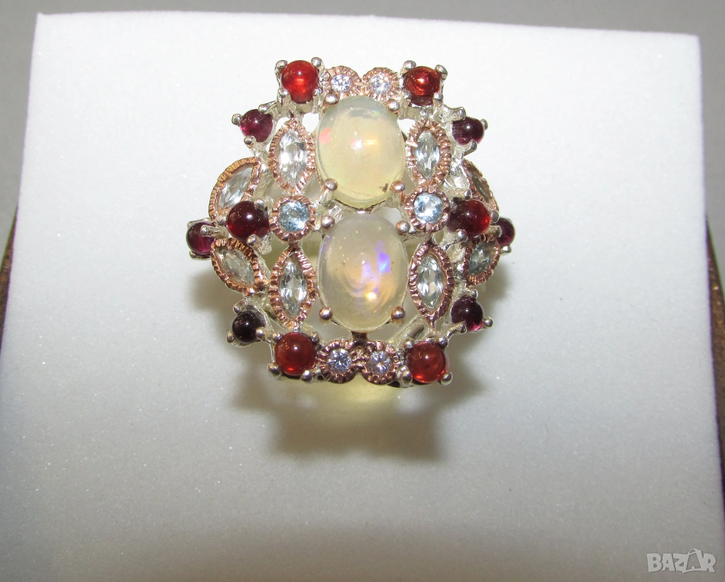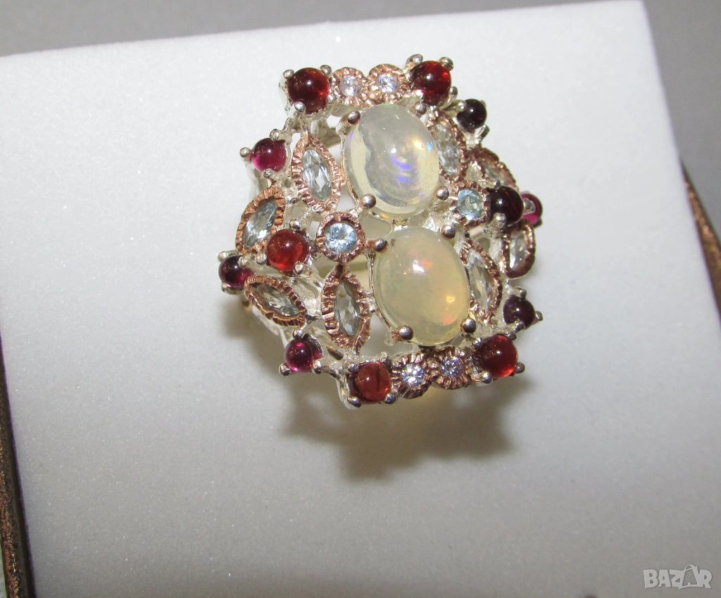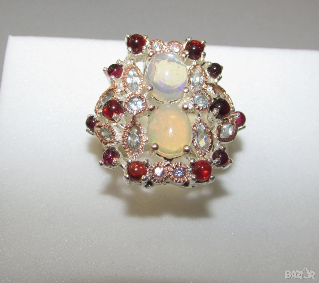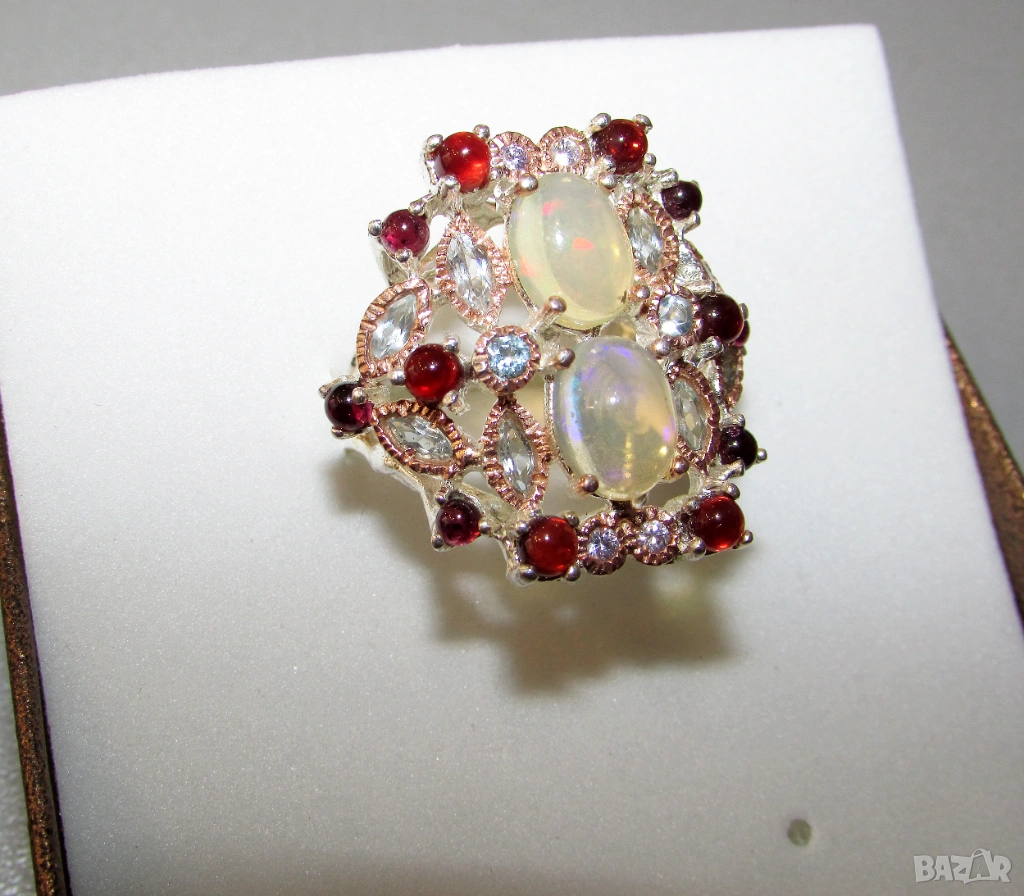 925 сребърен пръстен с етиопски опали. Опали 9х7мм, тегло на пръстена 10.5гр. Другите камъни са топаз и гранат. Халка 7/55. Цена 90 евро.