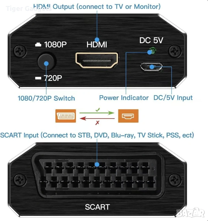 Конверторът поддържа резолюции 720p и 1080p, като осигурява ясно и стабилно изображение. Подходящ е за използване с устройства като VHS плейъри, DVD, сет-топ боксове (STB), игрови конзоли (PS3, Xbox) и други източници със SCART изход.