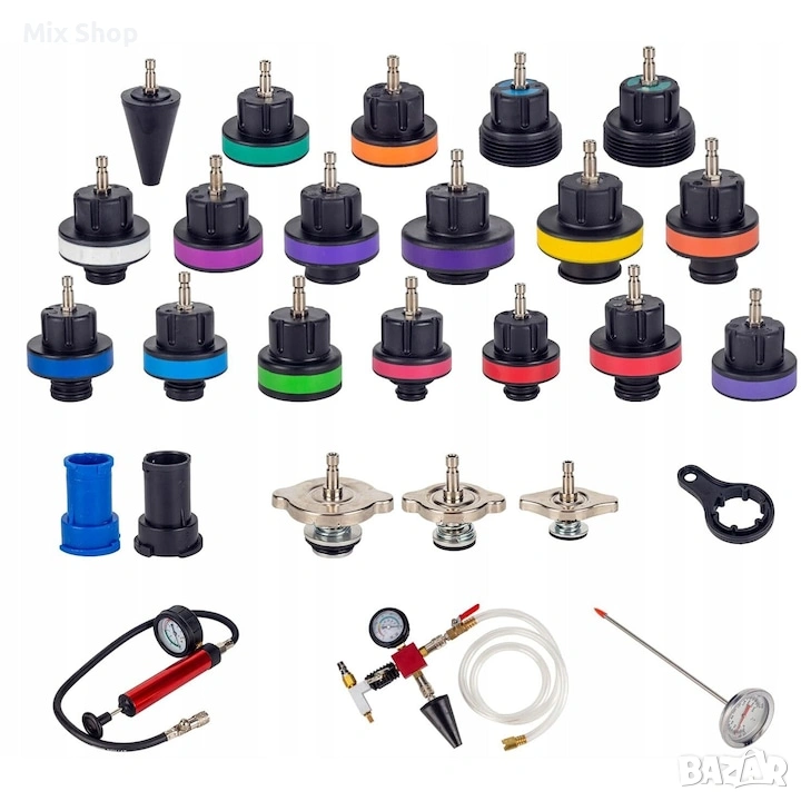 АДАПТЕРИ ЗА РАДИАТОРИ - Комплектът за вакуумно пълнене на радиатора и тест за течове включва общо 21 цветно кодирани адаптери за радиатори, включително 17 специални адаптери за радиатори, 1 универсален конусен адаптер и 3 адаптера за алуминиеви гнезда за тестване за течове при пълнене на радиатора и охлаждащата течност. Подходящи са за почти всички видове радиаторни отвори в класически и модерни автомобили.