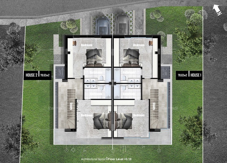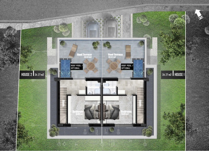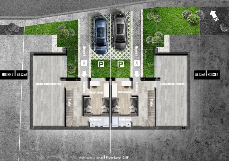 Къщата е проектирана с функционално разпределение на четири нива - 3 надземни етажа и едно подземно ниво с възможност за адаптиране, според нуждите на бъдещия собственик, давайки свобода за довършване по индивидуален проект.