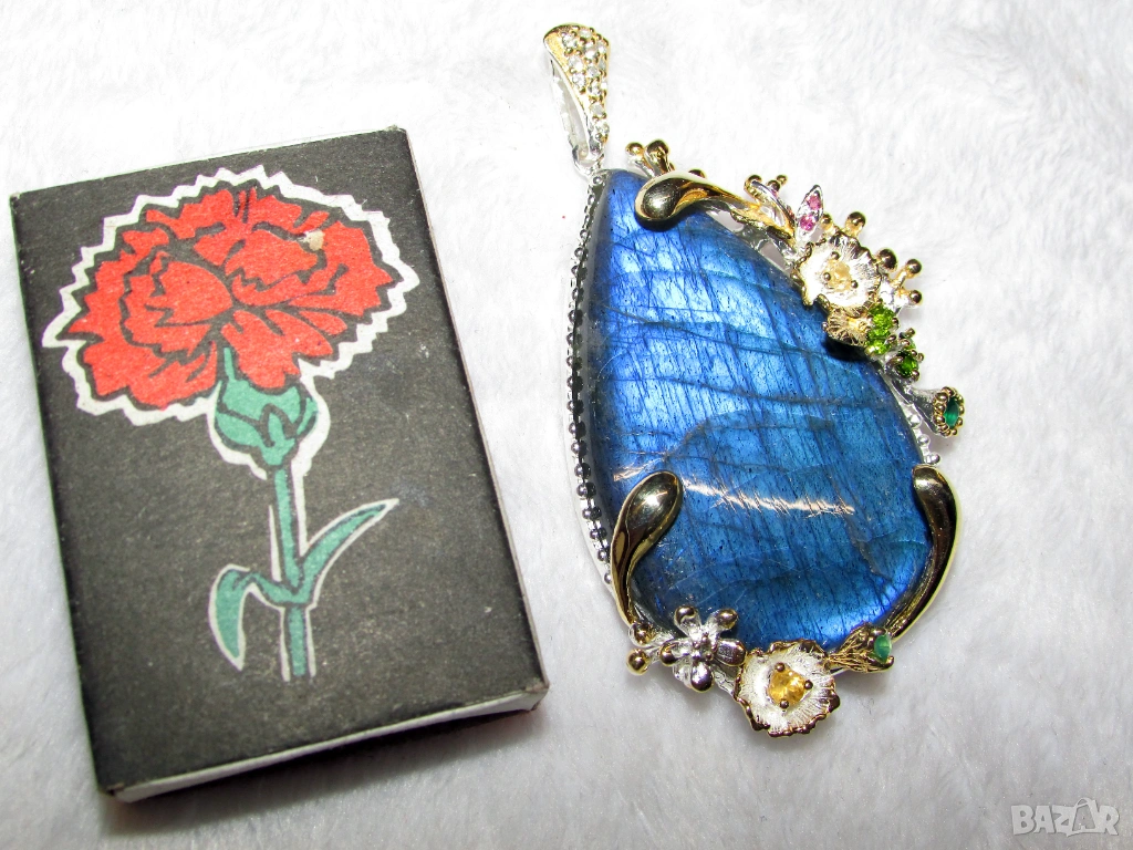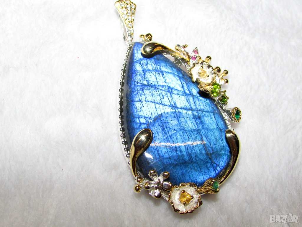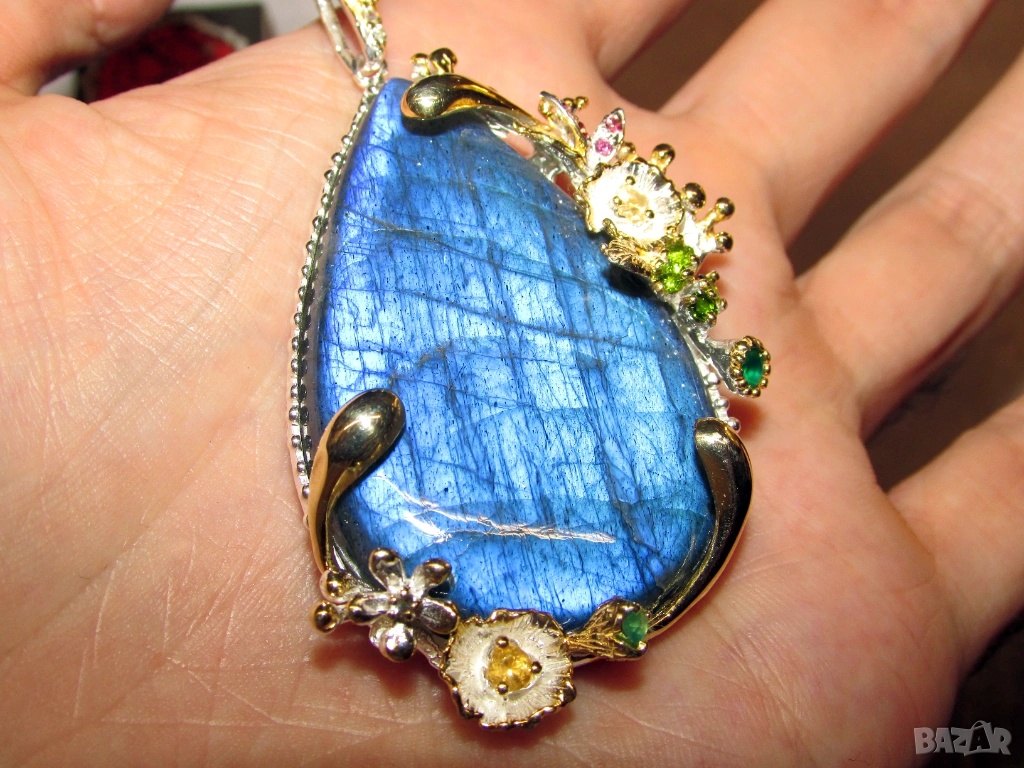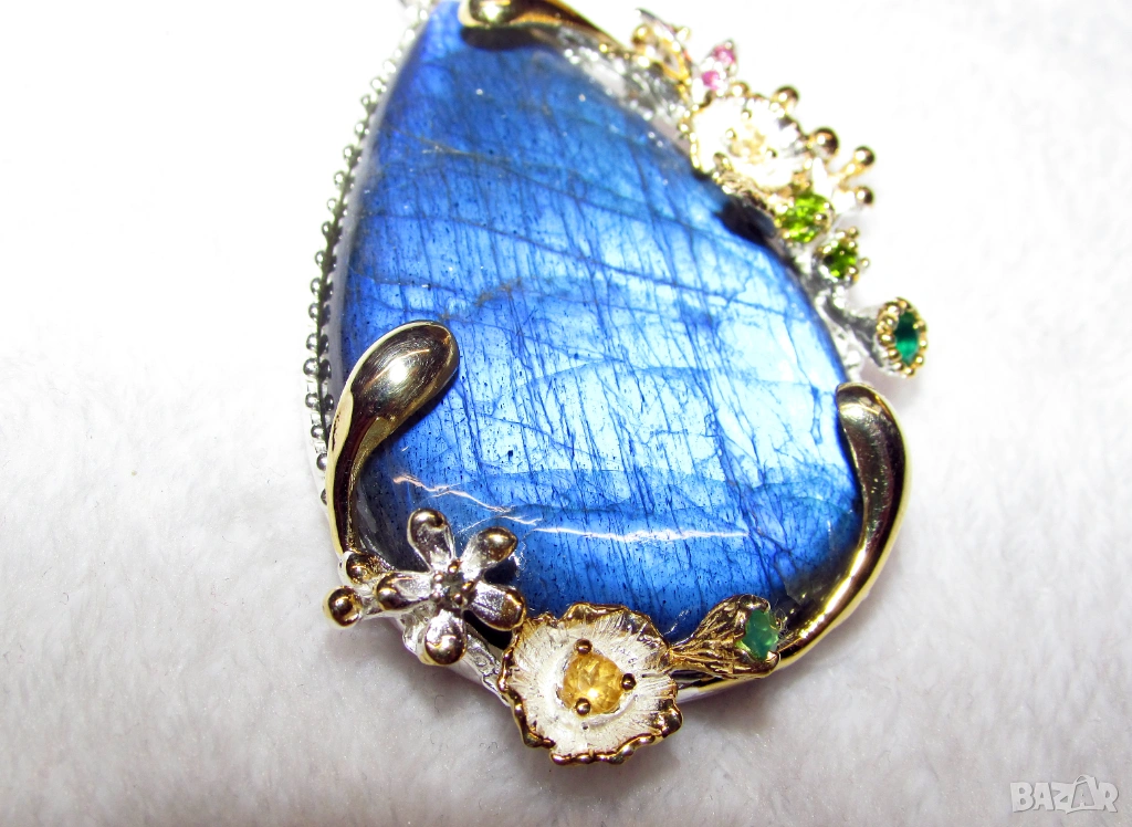 925 Масивно сребърно колие с 85 карата африкански лабрадорит, размери на камъка 72x37x12, тегло на колието 32.9гр. Златно покритие. Другите камъни са оникс, цитрин и хром диопсид.