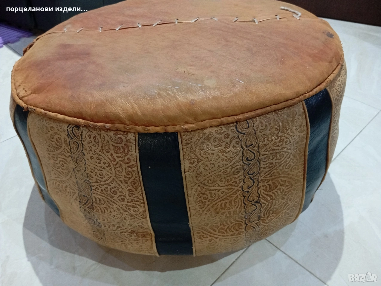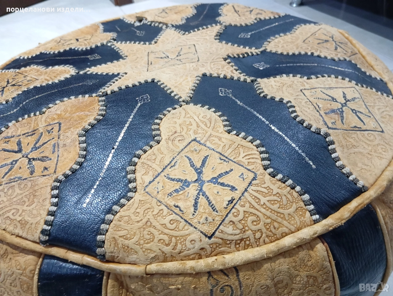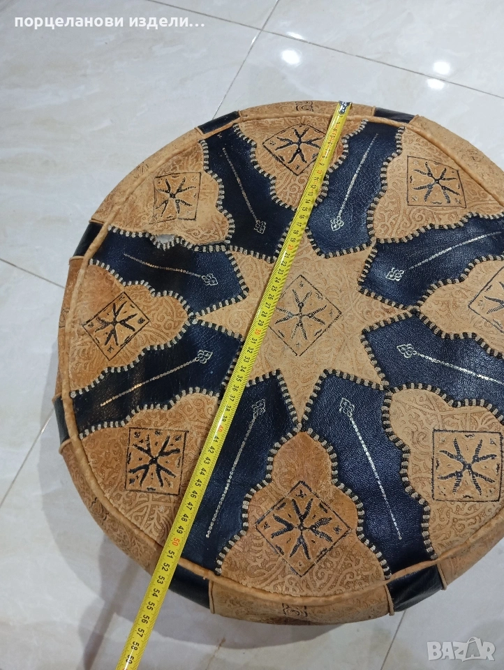 Автентичен марокански пуф табуретка ръчно изработен от естествена кожа → Обява 53976352
