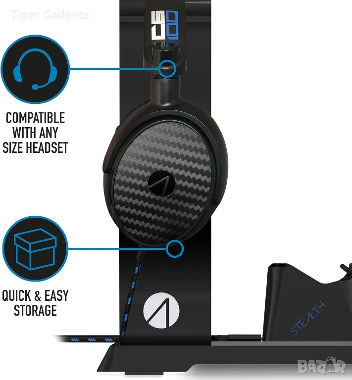 STEALTH SP-C60 е практична зарядна станция за PS4 контролери, комбинирана със стойка за слушалки, която помага да поддържате гейминг пространството си подредено и организирано.