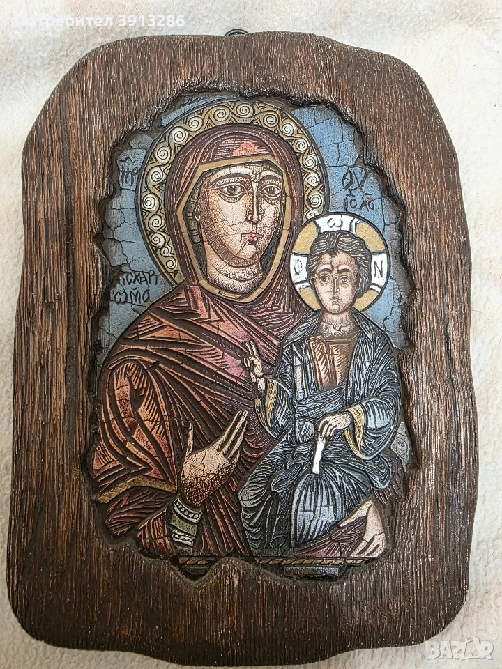 Ръчно рисувана икона на Света Богородица Одигитрия. Изображението на Божията Майка с Младенеца е поставено в интересна дървена рамка, която му придава нестандартен, но в същото време стилен вид. Размер 21/15 см.