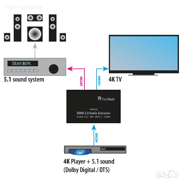 Устройството поддържа 4K резолюция при 60Hz с HDR и Dolby Vision, като предава видеото директно към телевизор или монитор, а аудиото може да бъде отделено към саундбар, усилвател или активни колони.