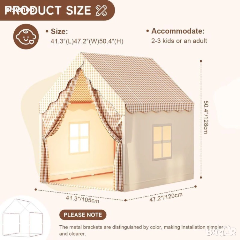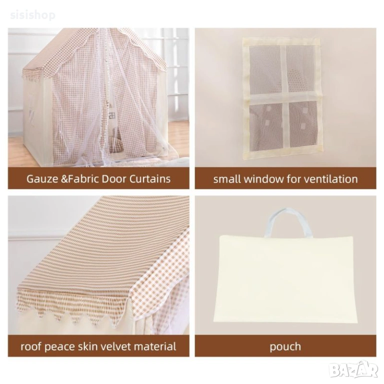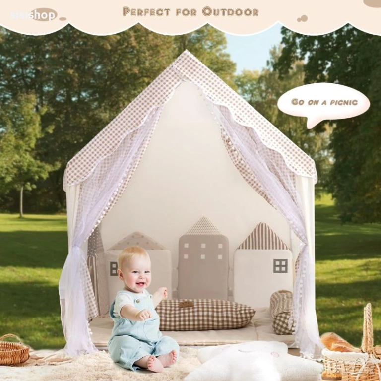 Търсите стилен и практичен подарък, който ще се превърне в любимото място на вашето дете? Тази приказна детска къщичка с дизайн в бежово каре е идеалният избор за създаване на уютен кът за четене, игри и мечти. Изработена от нежен и качествен текстил, тя внася топлина в детската стая и предлага собствено защитено пространство за малчуганите. Благодарение на двата прозореца и светлите кремави цветове, вътре е винаги приятно и светло, а елегантният кариран покрив я прави чудесен декоративен елемент за дома.