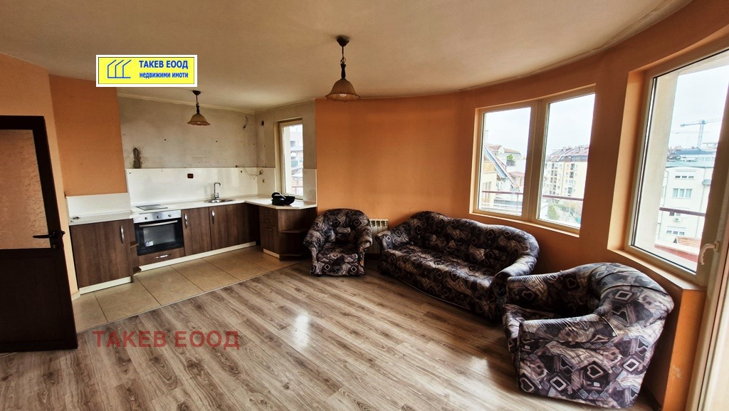 Ексклузивно в 'Такев' ЕООД - Тристаен апартамент в сграда с акт 16 от 2016г. на улица 'Чавдар Мутафов' в близост до бул.'Филип Кутев' - на тихо, но комуникативно място с отлични гледки. Състои се от : хол с кухненски бокс, преходен за една стая, втора самостоятелна стая, баня с тоалетна + втора баня с тоалетна с място за пералня/сушилня към преходната стая, голям балкон пред хола. Квадратура с общи части по площообразуване - 97.88 кв.м, застроена площ - 84,61 кв.м., отделно мазе в сутерена - 1,7 кв.м. Имотът може да бъде ползван или отдаван под наем в този си вид или след освежителен ремонт , като двете бани са в добро състояние на плочките (за леки ремонти), ламинат - за смяна, стени и тавани - за освежаване. Има инсталация за топла вода и отопление (радиатори и лири), но трябва да се постави ново газово котле. Огледи - с ключ!
