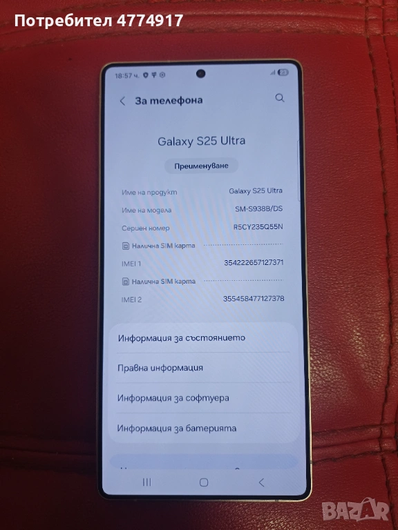 Продавам Samsung Galaxy S25 Ultra, 256GB. Телефонът е в отлично техническо и визуално състояние, без никакви забележки. Използван е винаги с калъф и протектор.