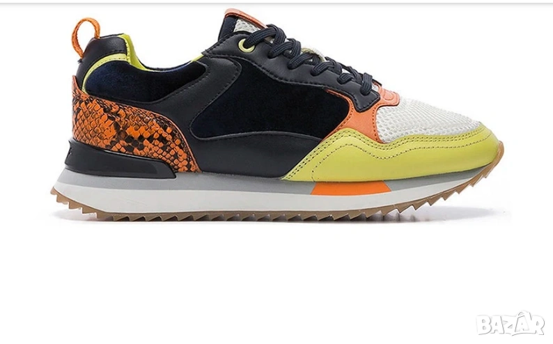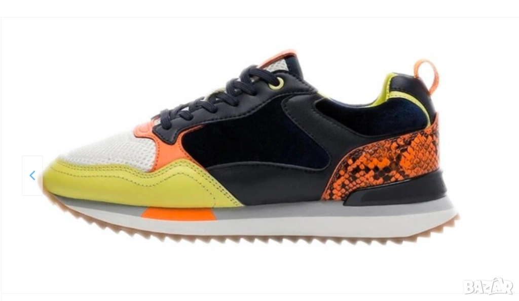 Моделът се отличава с многоцветен дизайн, включващ детайли с „змийска“ кожа в оранжево, сини велурени елементи и жълти акценти.