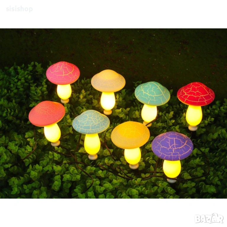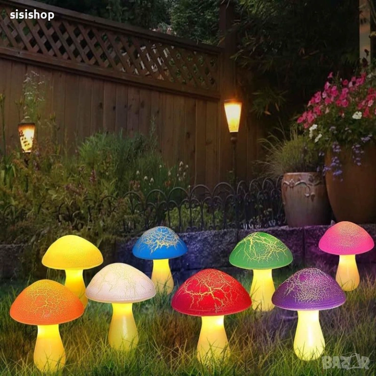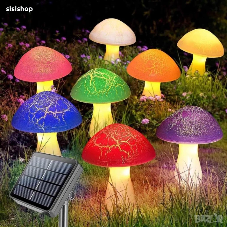 Комплект 8 броя Соларни Градински Гъбки с 8 Режима на Светене и Сензор за Здрач