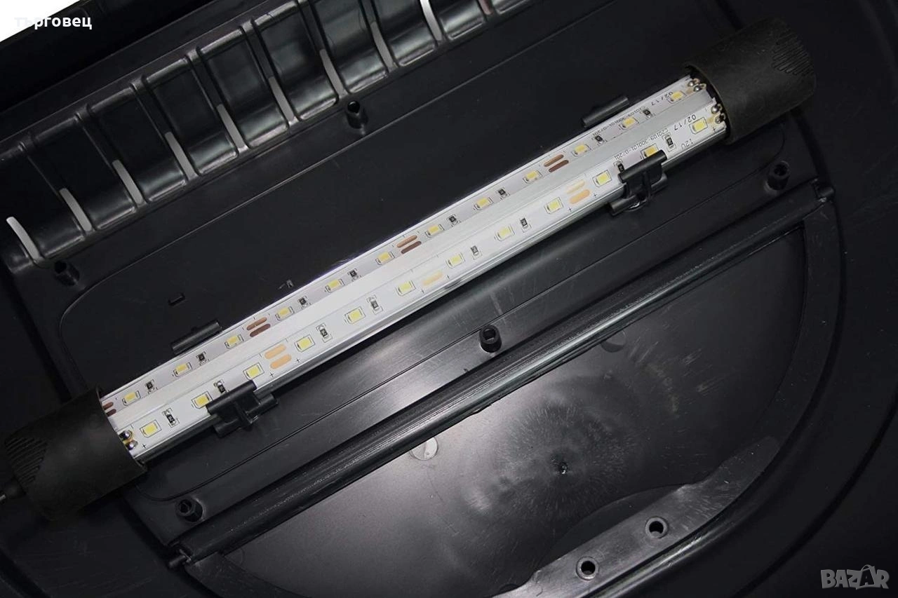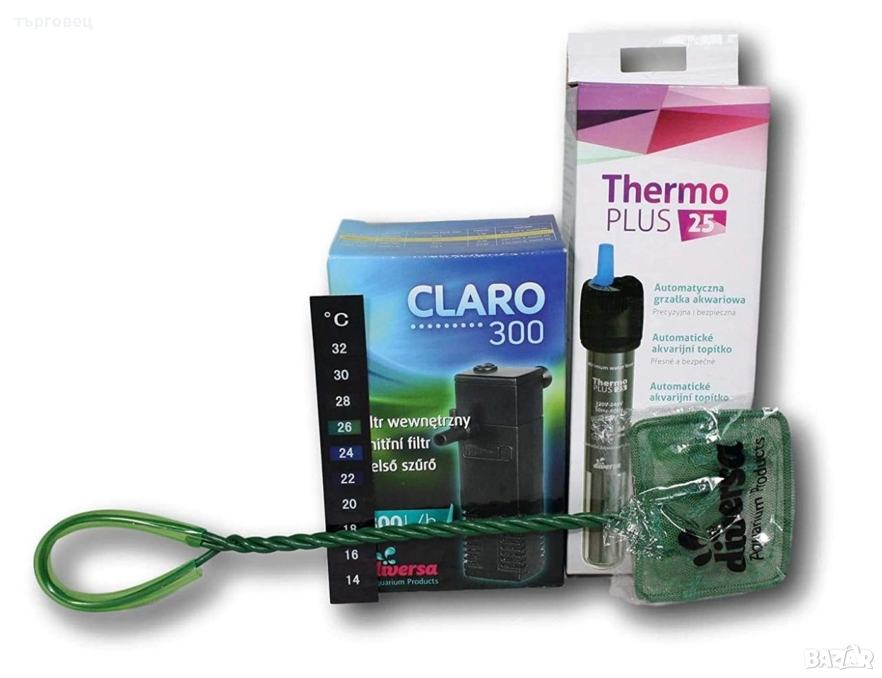 -правоъгълен аквариум 40x25x25см от 3мм стъкло, -модерно пластмасово осветление, включващо 6W LED осветление -вътрешен филтър с поток от 300l / h, включително спрей бар, с регулиране на дебита -25W нагревател с термореле -термометър -кепче -Уреди за поддръжка(последна снимка) + Подарък отделение за по-малки риби
