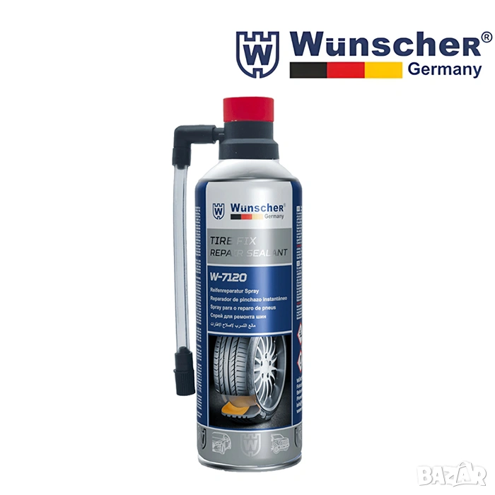 Уплътнява пробиви и напомпва гумата.