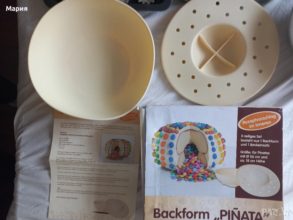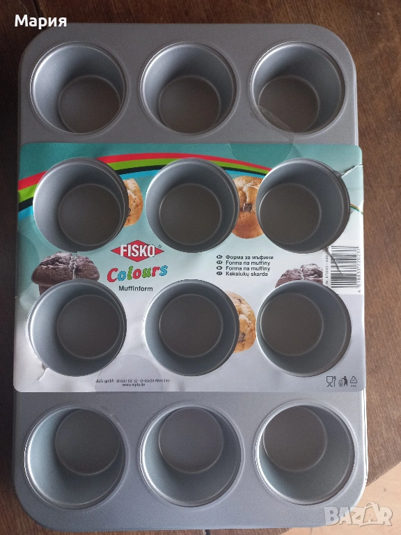 Тава (форма) тефлон за 12 мъфини 27 см/39 см; диаметър гнездо 7 см. Цена: 3,50 евро Кръгла релефна форма с горен диам. 20 см, долен диам. 15 см; Кръгла метална форма с горен диам. 24 см, долен диам. 12 см и вис. 10 см; Цена общо на двете общо 2 евро