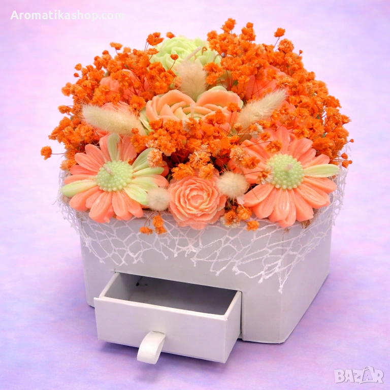 Контрастът между ярките флорални форми и фината декоративна мрежа създава хармония между нежност и динамика. Деликатните рози, маргаритки и сухи акценти оформят богата текстура, а леко изваденото чекмедже добавя характер и усещане за луксозен подарък.