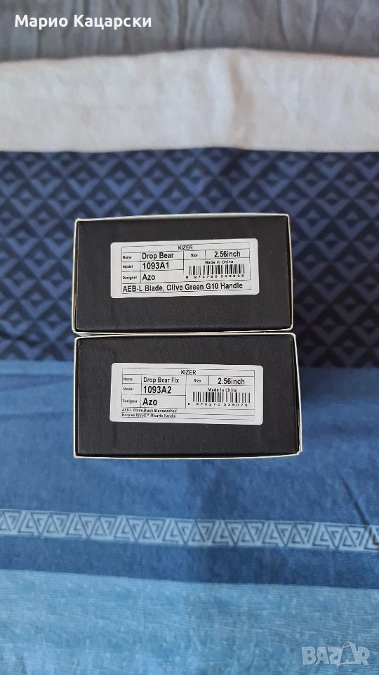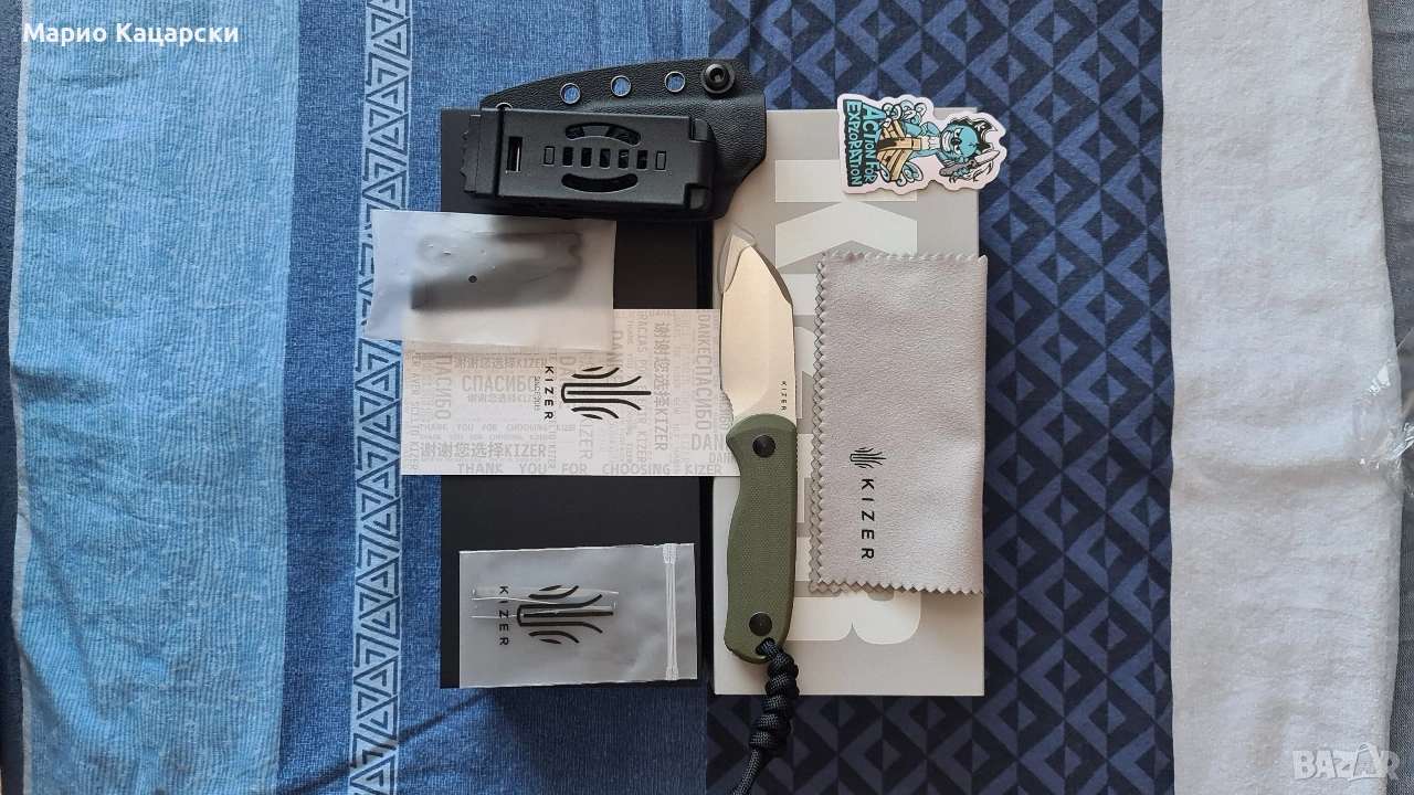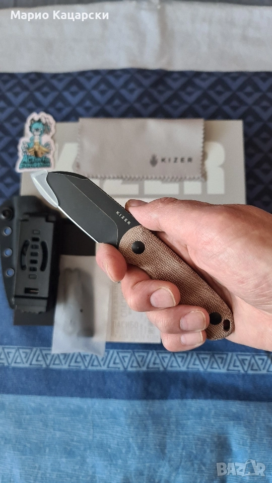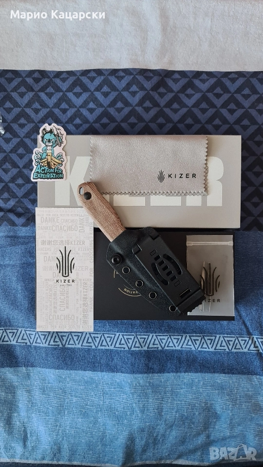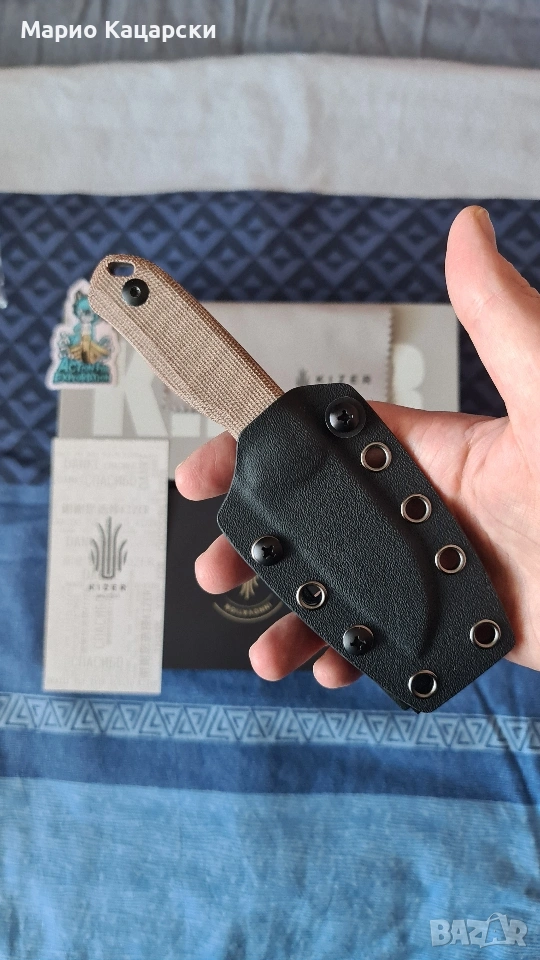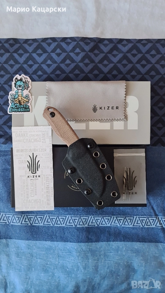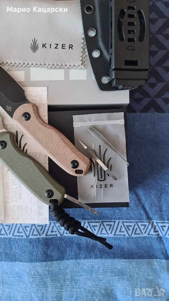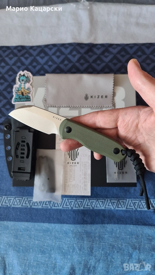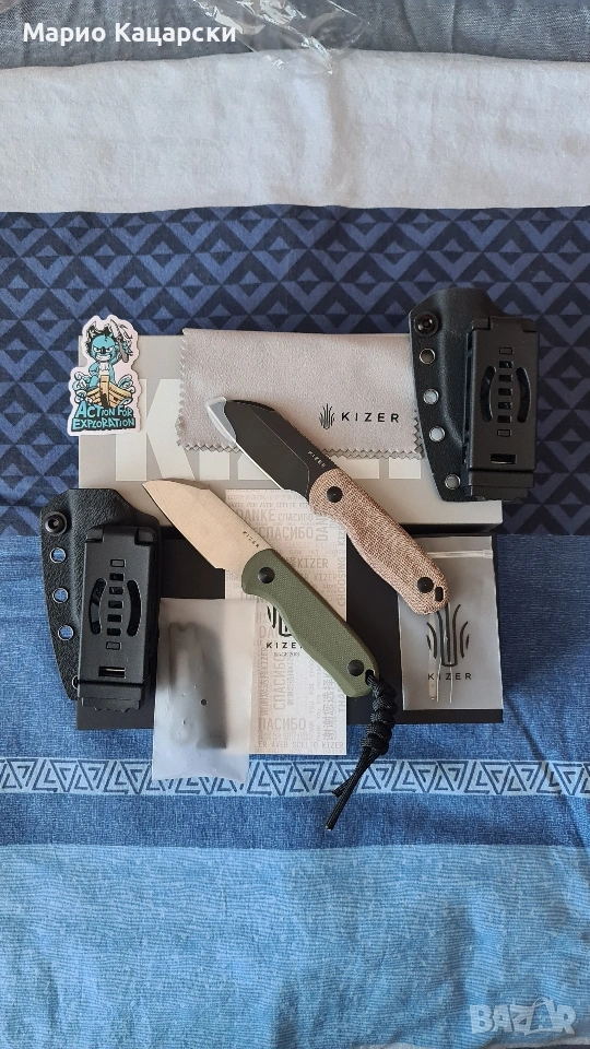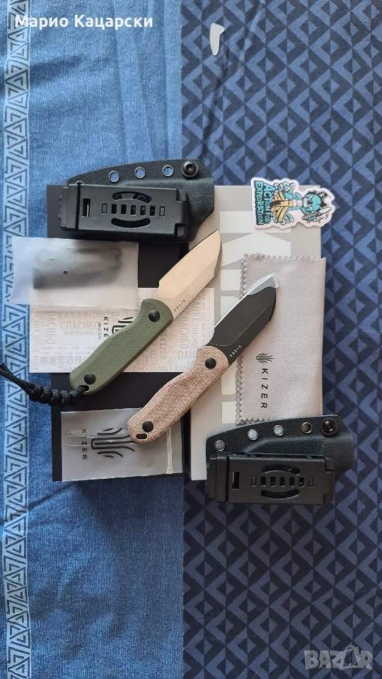 Здравейте, продавам два броя Kizer drop bear fix по дизайн на небезизвестния Azo със стомана AEB-L. В комплекта има и кайдексова кания с клипс за колан. Специфичното на модела е, че в дръжката си има пинсета и клечка за зъби като VICTORINOX.