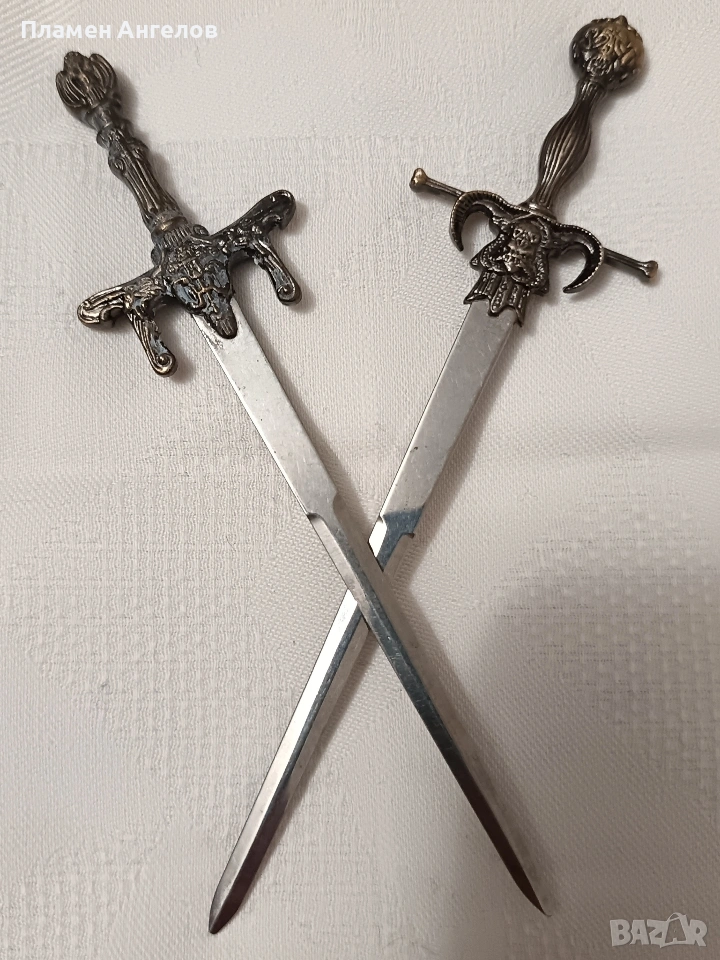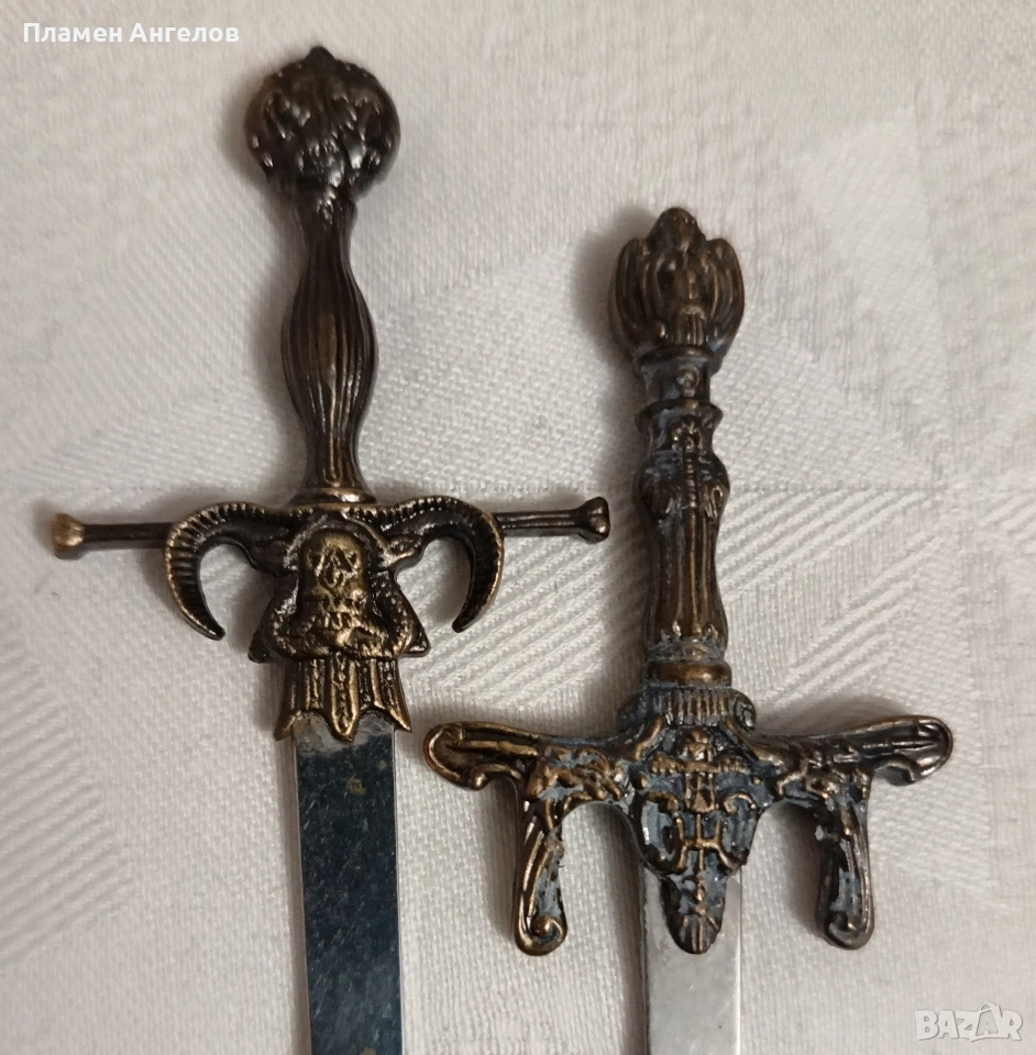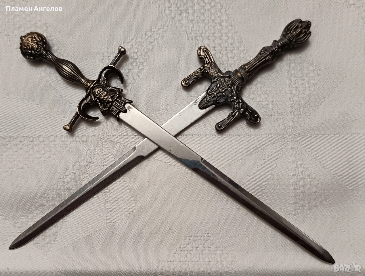 Два броя изключително детайлни, декоративни миниатюрни меча - ножове за писма или колекция. Предметите са в отлично състояние с много добре запазени орнаменти по дръжките. Дължена 14.5см.Метална сплав с античен финиш бронз/никел и остриета от неръждаема стомана. Единият е с мотив "Конник. на апокалипсиса" и вторият череп и рицарски елименти. Стил "Толедо" Испания. известни с висококачествени изработки.