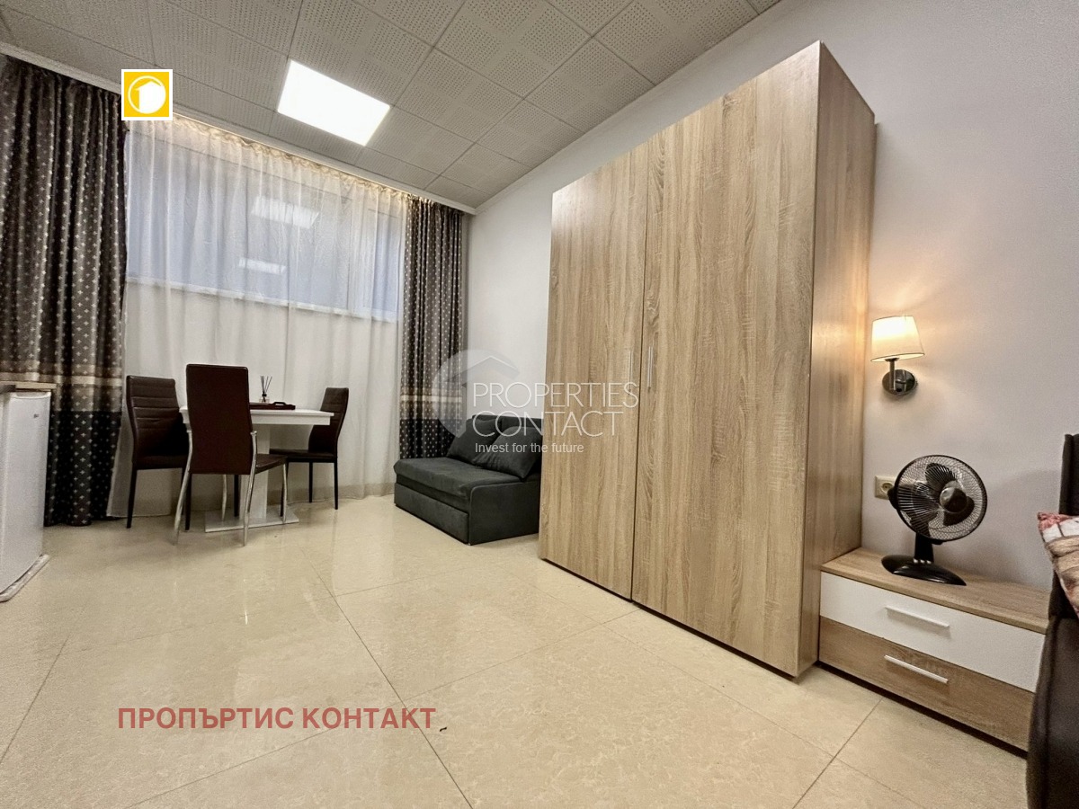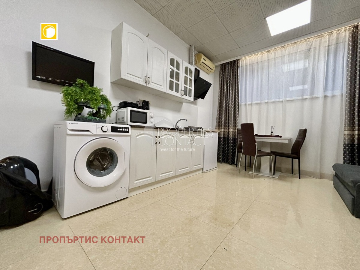 Предлагаме за продажба уютно и напълно обзаведено студио в Слънчев бряг, разположено в премиум комплекс „Тарсис“, известен със спокойната си атмосфера, зелени площи и отлична поддръжка. Имотът е отличен избор както за лично ползване, така и като инвестиционен имот с потенциал за отдаване под наем. Студиото е с площ от 34,24 кв.м и е функционално разпределено, като включва входно антре, светло основно помещение с кухненски бокс и спална зона, както и баня с тоалетна. Жилището се намира на сутеренен етаж, което осигурява прохлада през летните месеци. Разполага с голям отваряем прозорец, който осигурява естествена светлина и добра вентилация. Липсата на тераса е компенсирана от удобното вътрешно разпределение и комфорта на самия комплекс. Имотът се продава напълно обзаведен с качествени мебели и техника, готов за нанасяне или отдаване под наем веднага. Комплекс „Тарсис“ се намира в тиха и зелена част на Слънчев бряг, далеч от шума, но същевременно с лесен достъп до плажа и централните зони на курорта. Това го прави предпочитано място за семейна почивка и целогодишно ползване. Удобства в комплекса: • Аквапарк • Волейболно игрище • Два ресторанта с разнообразна кухня • СПА център • Два басейна за възрастни, включително 30-метров басейн • Два детски басейна • Детска площадка и анимация • Озеленени площи и зони за отдих • Паркинг • Контролиран достъп и поддръжка Такса поддръжка: 14 евро/кв.м на година.