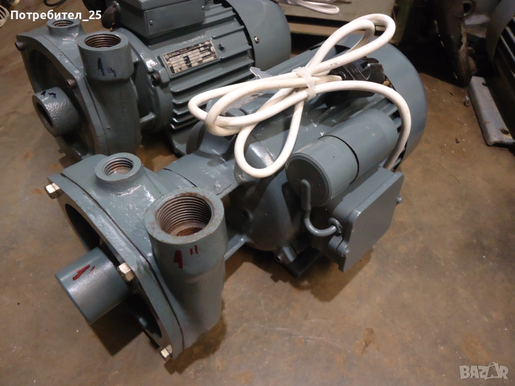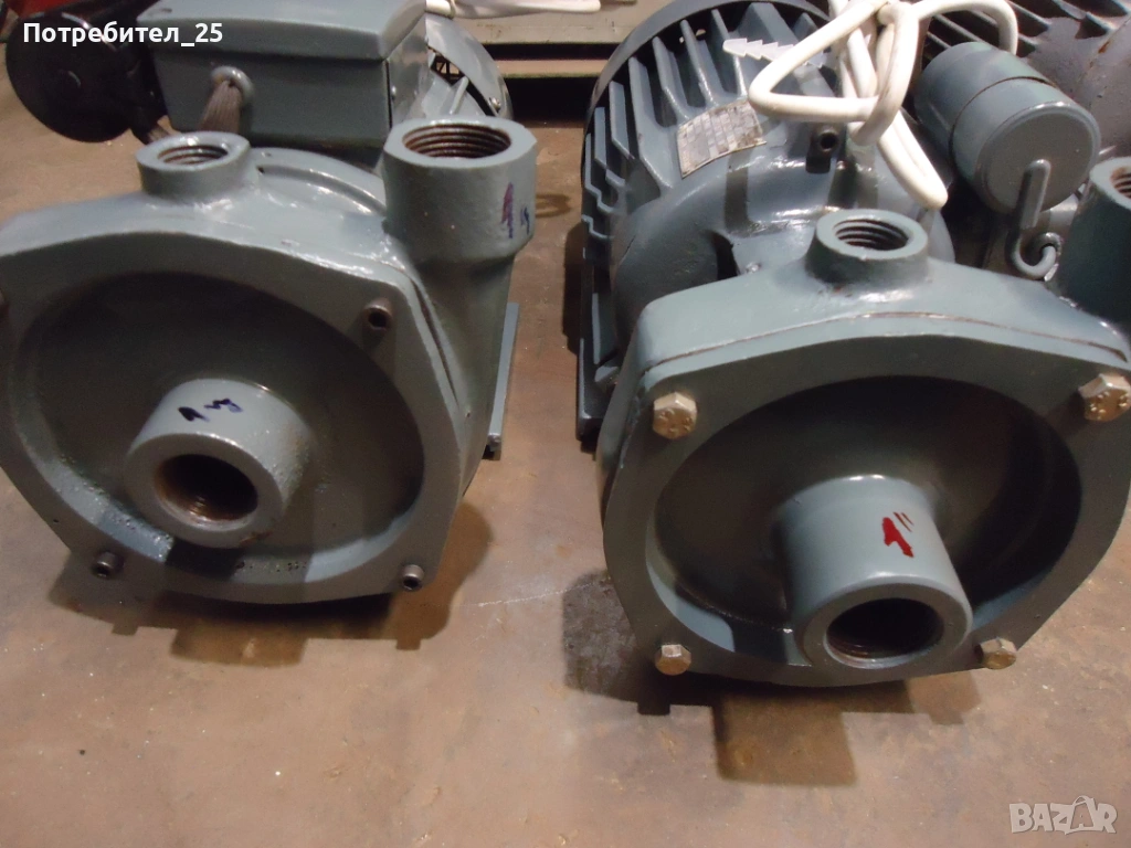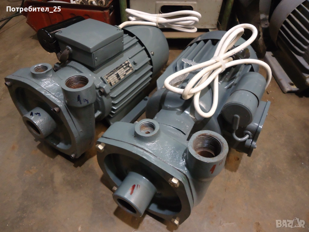Едната помпа е с фибър който е сменен,другата помпа е с лоена набивка и тя е сменена а на ротора където уплътнява е направена фтулка от неръждавейка..Входа и ихода са 1 цол. Резбите са здрави. Мотораите са 0,75кв работят отлично.