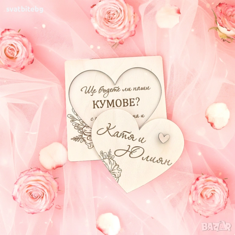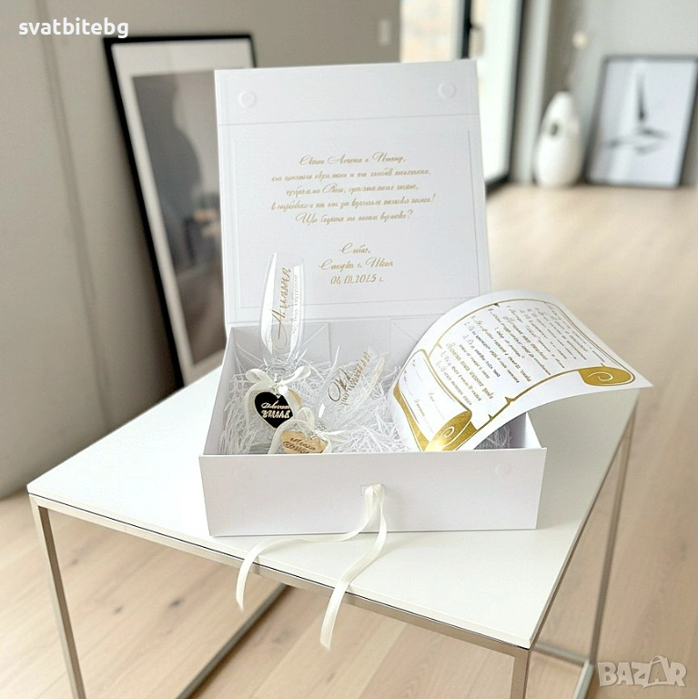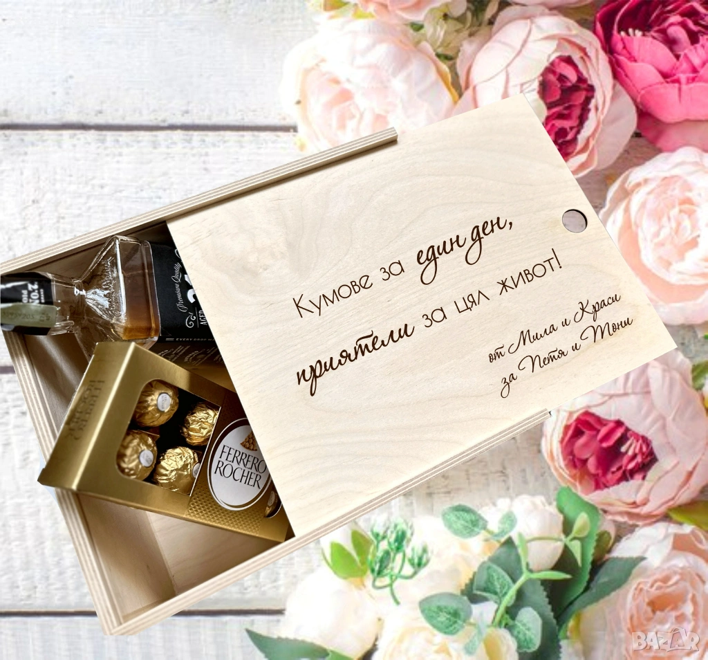 Добавете имена, дата, кратко послание или въпроса „Ще бъдете ли наши кумове?“ – всяка кутия се изработва с индивидуален надпис, съобразен изцяло с Вашата идея и стил на тържеството.